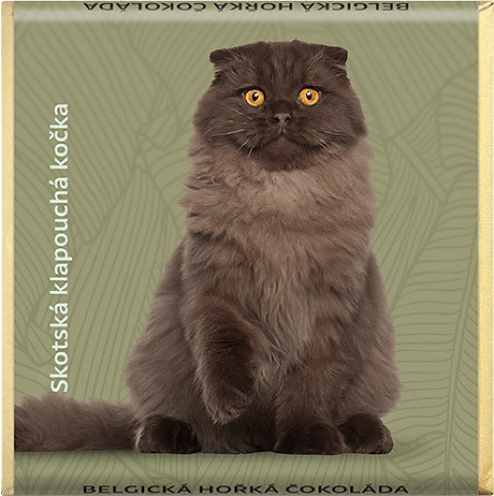 Kvalitní hořká čokoláda s motivem skotské klapouché kočky zaručeně udělá radost všem chovatelům a milovníkům koček.