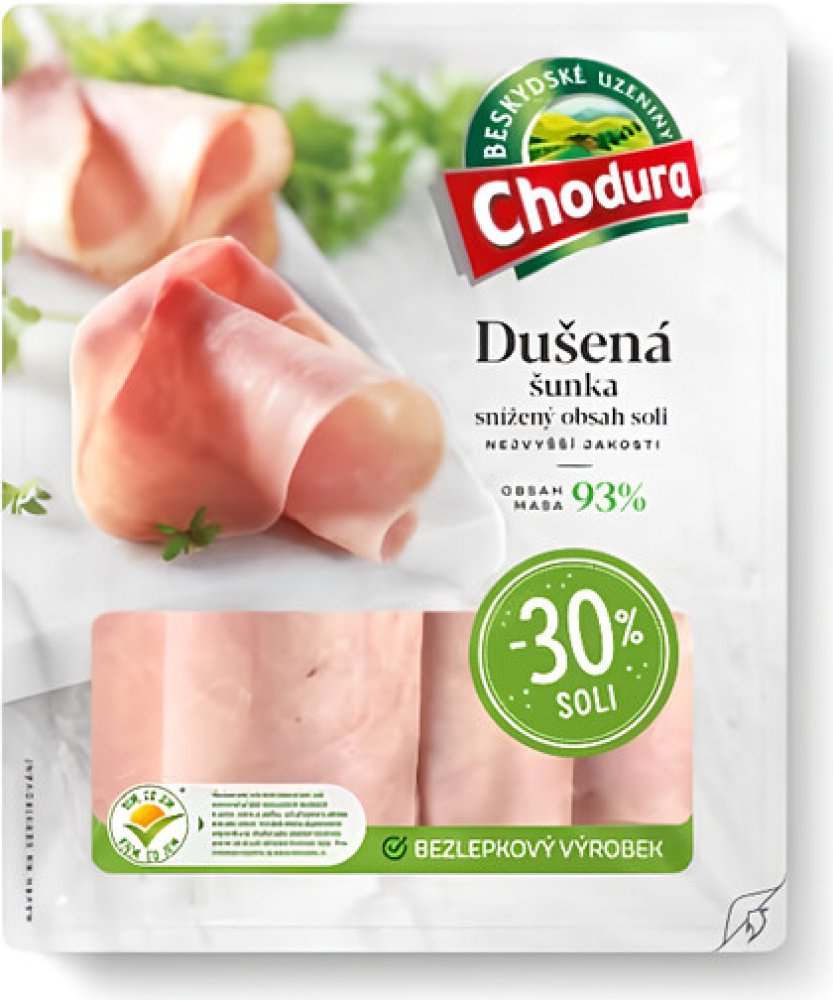 Chodura Dušená šunka se sníženým obsahem soli nejvyšší jakosti 93% masa 100 g