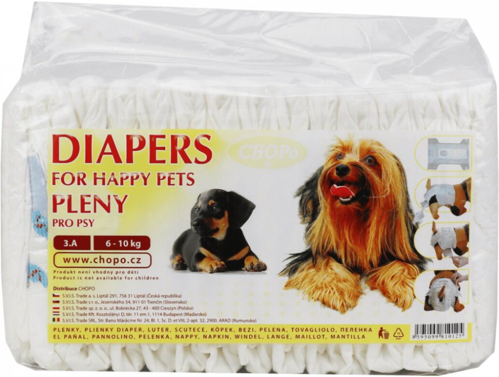 Jednorázová absorbční plena pro psy, zejména štěňata, háravé feny, nemocné psy atp. vhodná na cesty, v domácnosti či pobytu na zahradě, v noci či ve dne. Pleny jsou vyrobeny tak, aby byly pohodlné a nijak nebránili v pohybu. Jemná a měkká povrchová vrstva z netkaného textilu odvádí rychle vlhkost. Mimořádně savý materiál vstřebává rychle tekutinu a vnější folie spolehlivě chrání před prosáknutím. ...