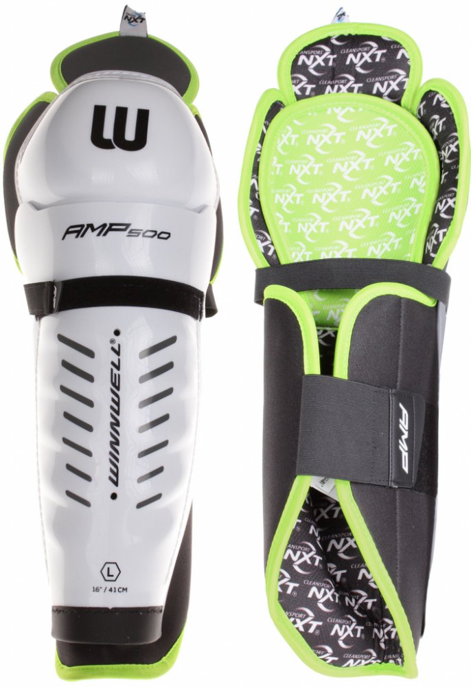 Vnitřek holení je stejně jako u všech chráničů AMP500 opatřen patentovaným NXT materiálem, který zabraňuje vzniku nežádoucích bakterií. Vnitřní polstrování je na velmi dobré úrovni, nohy jsou tak jako v bavlnce. Díky použitému materiálu chrániče velmi dobře vysychají. Uchycení je řešeno širokým pásem se suchým zipem v oblasti lýtka a menším páskem pod kolenem. Holeně tak velmi dobře drží na svém místě, nemusíte tak zbytečně plácat dlouhé metry izolací. V případě juniorských velikostí je uchycení pouze v jednom bodě a to širokým páskem přes lýtko. Chrániče nejsou ještě tak dlouhé jako u seniorských velikostí a proto není dvojí uchycení potřeba. Celkově povedené hokejové chrániče, které pořídíte za pár korun a které Vám velmi dobře poslouží.
