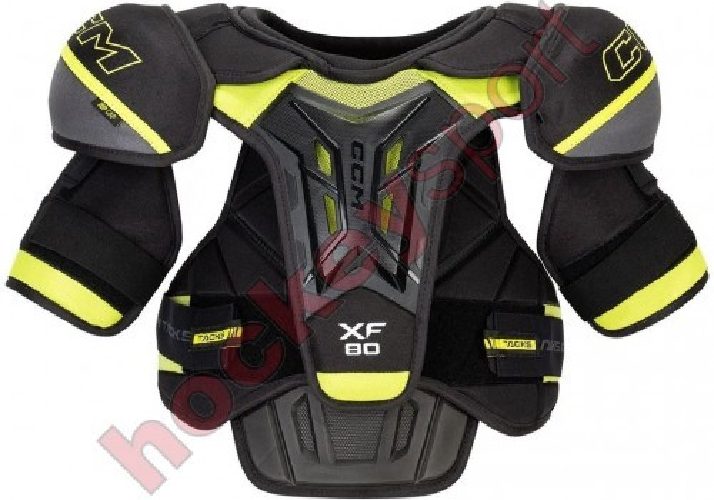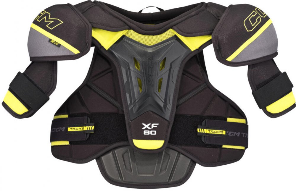 CCM TACKS XF80 Hokejová ramena juniorská.Mladší hráči si zaslouží vynikající pohodlí a lehkou, ale odolnou ochranu, a přesně to poskytují ramenní chrániče TACKS XF80. Tyto chrániče jsou vyrobeny z dvouvrstvé PE pěny s lisovanými panely a nabízejí nízkoprofilovou ochranu vhodnou pro jakoukoli soutěžní úroveň. Vysoce kvalitní komfortní podšívka navíc zajišťuje dodatečné proudění vzduchu, abyste se v nich cítili svěží.Dvouvrstvá přední konstrukce s pěnou PE + sublimovaná pohodlná podšívka: Pohodlný a nízkoprofilový dvouvrstvý ramenní chránič má vše, co potřebujete, abyste byli chráněni na jakékoli soutěžní úrovni.Ramenní krytky s vstřikovaným JDP: Tyto krytky jsou vyrobeny z lehkého PE plastu a poskytují konkurenceschopnou ochranu, která pomáhá rozptýlit nárazy mimo ramenní klouby.Lisované přední a zadní panely se sublimovanou podšívkou: Pohodlná a odolná ochrana díky sublimovaným zadním a předním panelům.Chránič z tvarovaného PE + nastavení délky: Individuální komfortní střih a vynikající ochrana s nastavitelným krytím a sublimovanou podšívkou.Plovoucí hybridní kryt hrudní kosti + lisovaná krytka páteře: Ochrana z lisovaného plastu.Sublimovaná komfortní podšívka: Vysoce kvalitní komfortní podšívka, která umožňuje proudění vzduchu a udržuje vás svěží.Pohyblivá ochrana klíční kosti: Navrženo tak, aby poskytovalo konkurenceschopnou úroveň ochrany klíční kosti.Přední panel s rozšířeným pokrytím: Přidaná ochrana pro soutěžní úroveň.