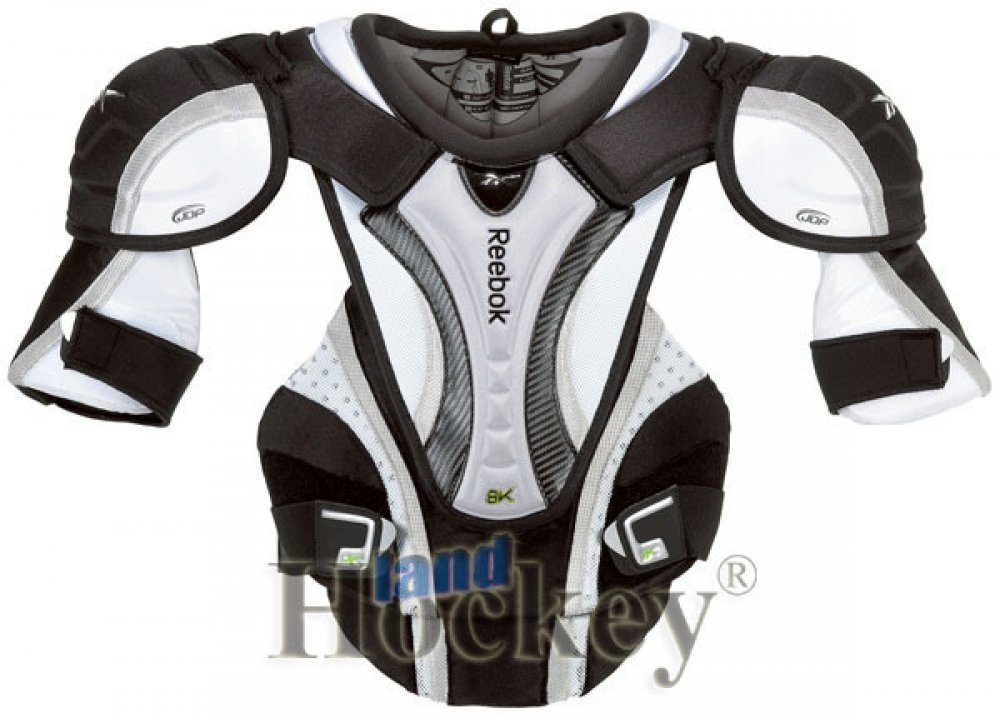 Ramena Reebok 8K určená na profesionální použití. Jedinečná KFS konstrukce těchto ramen zaručuje dokonalé usazení na těle při splnění maximální ochrany hráče. Přední část chráničů je dvoudílná, zadní část je dělená na tři díly. Velmi dobrá ochrana ramenc a klíčních kostí díky systému JDP. V oblasti vrchní části ramen je na vnitřní straně chráničů speciální pěnová výztuha s paměťovým efektem Memory Foam, což umožňuje dokonalé usazení chráničů. Chrániče rukou lze výškově nastavit do ideální polohy vůči chráničům loktů. Výhodou je prodloužený chránič břicha, který je ve své spodní části odnímatelný.