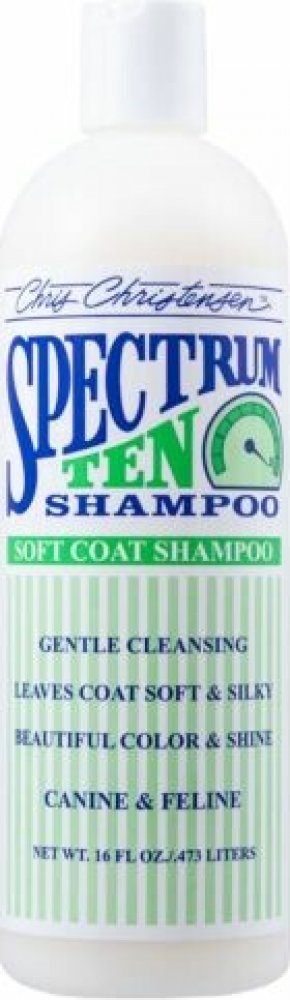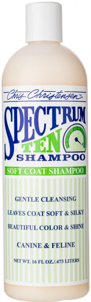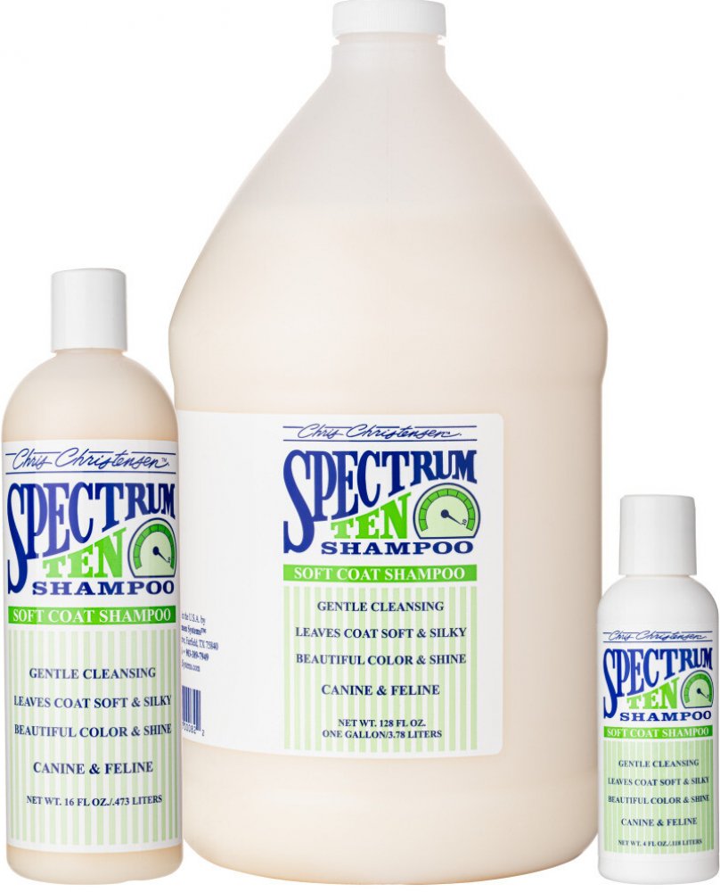 Spectrum 10 šampon je navržen specielně pro rovnou nebo vlnitou srst a vytváří pozoruhodně hladkou, lesklou a poddajnou srst už po prvním použití. Je obohacen speciálními přísadami, jemně čistí, aniž by ztratil účinky, přičemž hydratační a zvláčňují složky zanechávají srst hedvábnou na dotek i na pohled.
