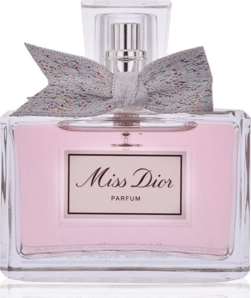 Flakon vůně Miss Dior zdobí emblematický vzor kohoutí stopy. Stříbrná mašle, uvázaná kolem hrdla, pak dotváří charakteristický couture nádech parfému Miss Dior.