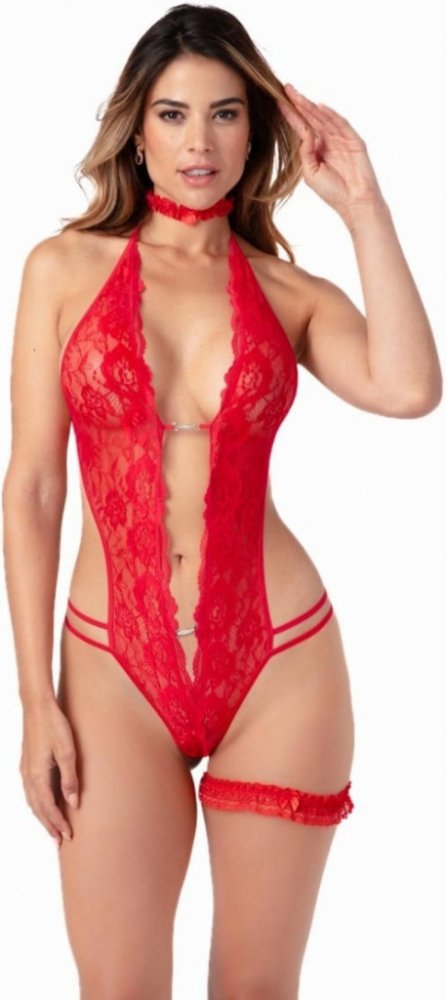 Červené body s otevřeným rozkrokem vyrobené z krajky s květinovým vzorem. Se zavazováním za krkem a na zádech. V balení dále najdete svůdný podvazek a choker na krk. 90 % polyamid, 10 % elastan.