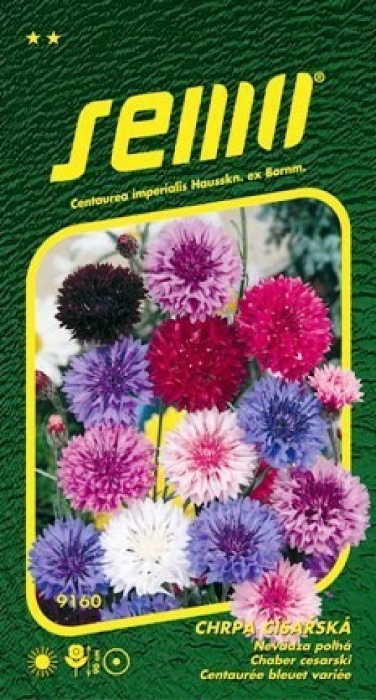 Chrpa císařská Centaurea cyanus / Nevädza polná SMĚS BAREV Směs bílých, modrých, růžových a karmínových, plných květů, výška 90 cm počet semen v gramu 220 (10 g na 1000 rostlin) přímý výsev březen - duben; do řádků 25 - 30 cm; 10°C termín kvetení červen - září Rychle rostoucí, vzpřímená a silně rozvětvená letnička. Listy jsou kopinaté, úzké, šedozelené. Je vhodná pro skupinové výsadby a k řezu. Ve váze vydrží 10 dní. Vyséváme přímo na pozemek, rostliny pěstované ze sadby mají tendenci k poléhání.