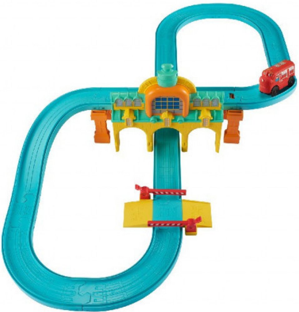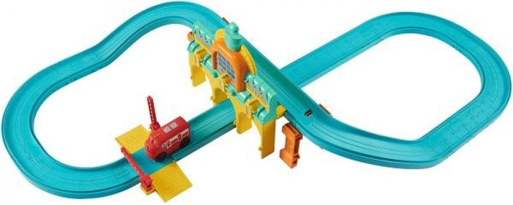 Vláčkodráha pro mašinky ze série Touch&Go a Look Alive s vlakovou stanicí a ručně ovladatelnou rampou.