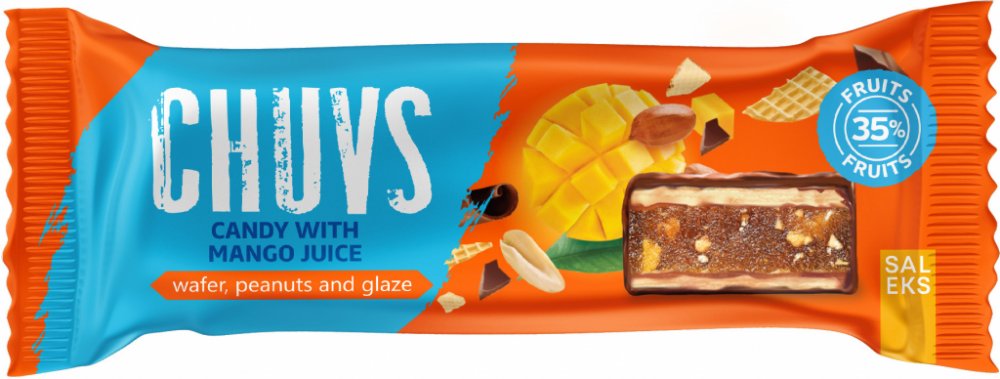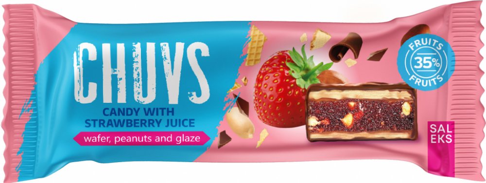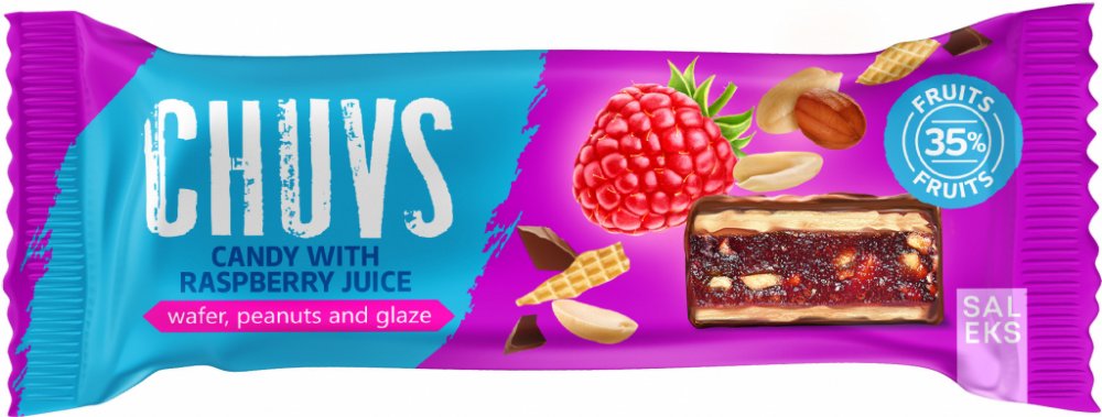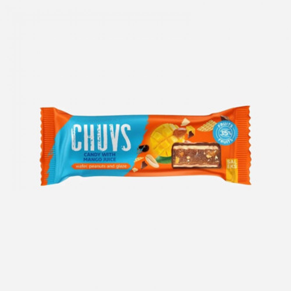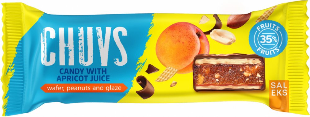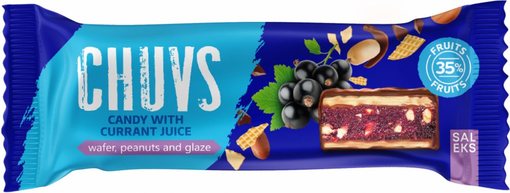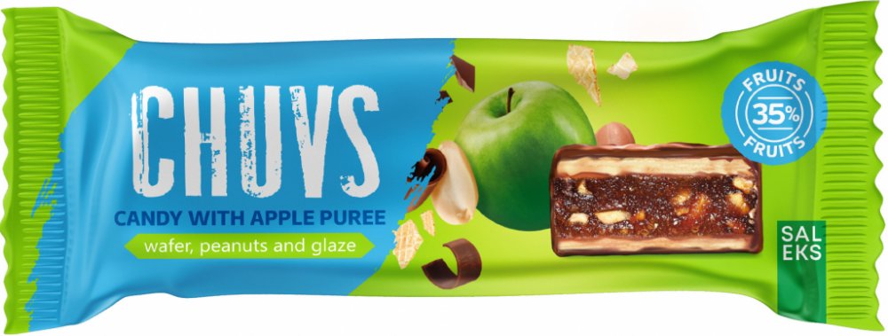 Cukrovinka ve tvaru tyčinky s jablečným pyré, rybízovou šťávou a praženými arašídy, celomáčená v kakaové polevě.