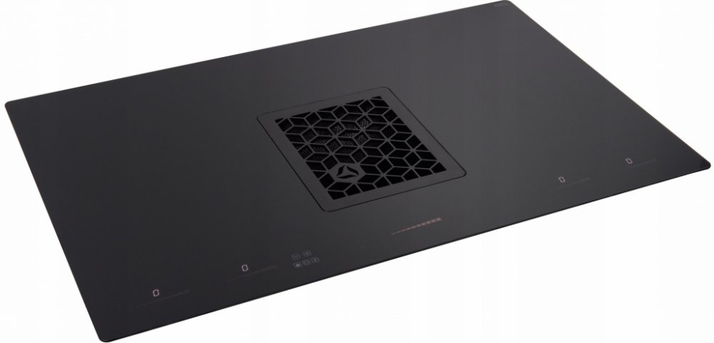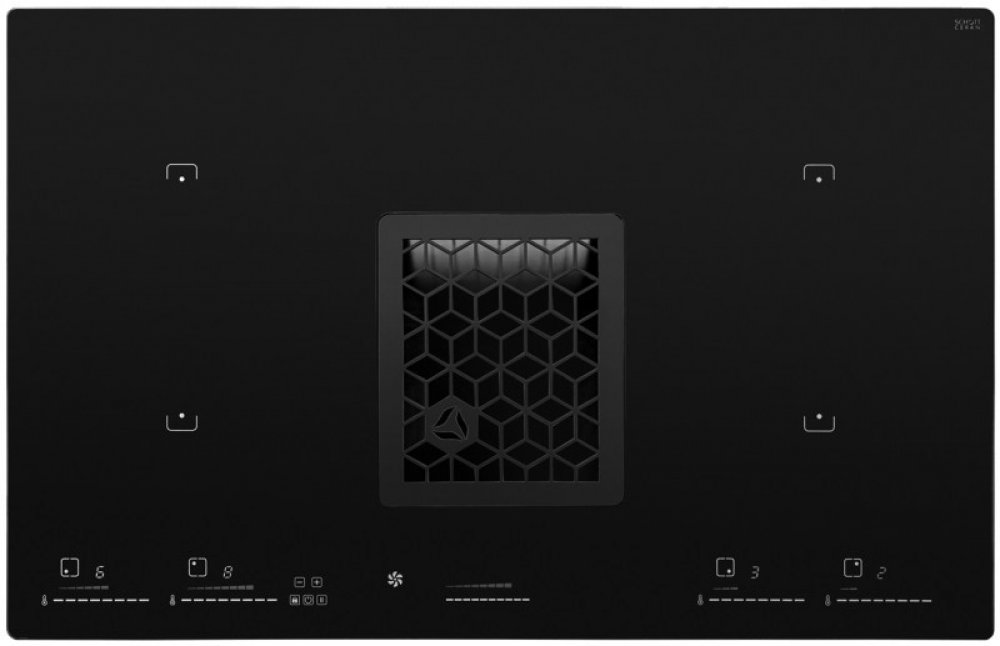 Indukční varná deska s integrovaným odsavačem par Wizard Black z prémiové řady odsavačů Ciarko Design; povrch desky z černého skla, rámeček integrovaného odsavače z černého kovu s matnou povrchovou úpravou;