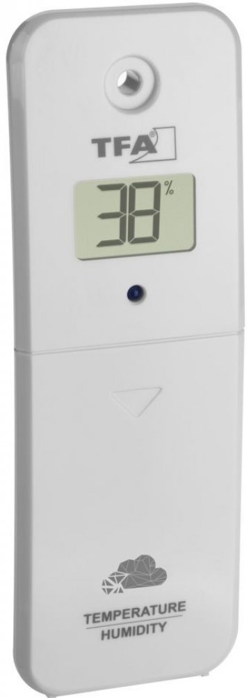 Bezdrátové čidlo TFA 30.3800.02 k měření teploty a vlhkosti. Pokud jej používáte jako venkovní vysílač, najděte si stinné místo chráněné před deštěm. Přímé sluneční světlo poskytuje nesprávné hodnoty a konstantní vlhkost zbytečně zatěžuje elektronické součástky.