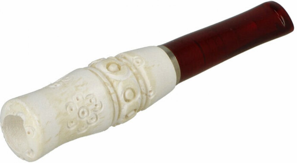 Krátká cigaretová špička Meerschaum bez filtru. Špičky na cigaretu Meerschaum od předního tureckého výrobce produkující nejen cigaretové špičky, ale především kvalitní dýmky z mořské pěny (dýmky Meerschaum). Ručně vyrobená špička z tureckého Meerschaumu je vybavená lesklým náustkem z akrylátu. Hladký lesklý povrch v přírodním odstínu je bohatě zdobený řezaným motivem. Meerschaum je organický neros...