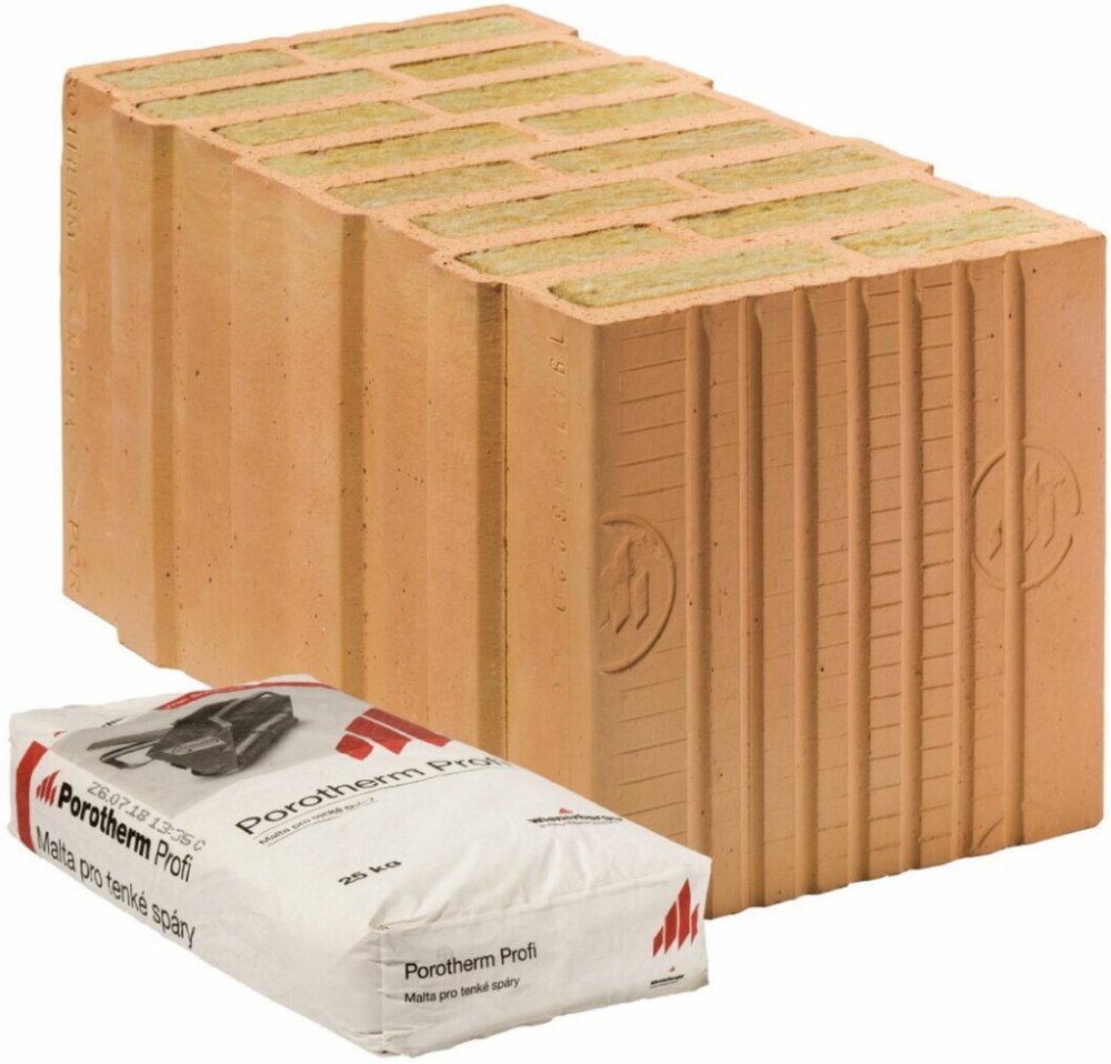 Cihly broušené Porotherm 50 T Profi jsou určené pro omítané jednovrstvé obvodové nosné i nenosné zdivo tloušťky 500 mm s velmi vysokými nároky na tepelný odpor a tepelnou akumulaci stěny. Velké otvory v cihlách jsou již ve výrobě vyplněny hydrofobizovanou minerální vatou. Hydrofobizace zajišťuje nenasákavost vaty v cihlách (voda po ní stéká).PoužitíPro omítané jednovrstvé obvodové nosné i nenosné zdivo tloušťky 500 mm s velmi vysokými nároky na tepelný odpor a tepelnou akumulaci stěnyKe zdění těchto cihel se používá malta pro tenké spáry, která se nanáší na celou plochu ložných spárVlastnostiDokonalé řešení lineárních tepelných mostů na styku s výplněmi otvorůVysoká životnost tepelné izolace integrované v cihláchLožná spára tloušťky 1 mm - minimální spotřeba malty, minimální množství vody vnesené do zdivaVysoká pevnostVýhodyIdeální spojení na pero a drážkuJednoduché a rychlé zděníŽádné tepelné mosty v ložných spáráchIdeální podklad pod omítkuNízký odpor proti difuzi vodních parTechnické parametryRozměry: d/š/v: 248×500×249 mmSoučinitel tepelné vodivosti bez omítek (λ): 0,064 W/mKSoučinitel prostupu tepla s omítkami (U): 0,120 W/m²KVážená laboratorní neprůzvučnost (Rw): 51 dBPevnost: P8Typ: vnější zdivoKonstrukční typ: nosnéRobotická cihla: neCihla pro jednovrstvé zdění: anoDodávkaCihly Porotherm 50 T Profi jsou dodávány zafóliované na vratných paletách rozměrů 1180×1000 mm. Počet cihel na paletě je 48 ks, hmotnost palety činí 1055 kg.