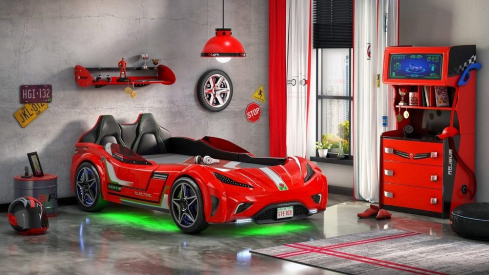 Sestava nábytku do dětského pokoje Champion Racer je jako stvořená pro nadšence do autíček. Do této sestavy nábytku jsme vybrali ty nejoblíbenější kousky. Středobodem pokoje se stane nejpropracovanější autopostel GTE v červené barvě. Postel má světelné a zvukové efekty, podsvícení podvozku vytvoří příjemné ambientní osvětlení pro usínání dítěte. Zvuky nastartování a túrování motoru naopak oživí hry během dne. Zvýšená zadní část napodobuje sedačky v autě včetně koženkového prošívaného čalounění. Postel má rozměr lůžka 100x190 cm a nosnost 130 kg. Jelikož se jedná o moderní "elektromobil", nesmí v pokojíčku chybět dobíjecí stanice. Komoda pumpa poskytne úložný prostor v podobě police s výklopnými dvířky, několika otevřených polic a třech šuplíků (první je rozdělený přepážkou). Noční stolek je lehký a snadno se přemístí dle potřeby. Má odnímatelné víko, uvnitř se mohou ukrývat třeba usínací plyšáci. Kovovou poličku připomínající spojler pověsíte kamkoliv na stěnu a vystavíte na ni drobné hračky či dekorace.
