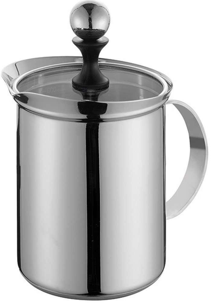 Šlehač na mléko DELUXE o objemu 800 ml z leštěné nerezové oceli s extra silným dnem o síle 4 mm, víčkem ze skla a s měrnou stupnicí. Vhodný na všechny typy varných desek včetně indukce.