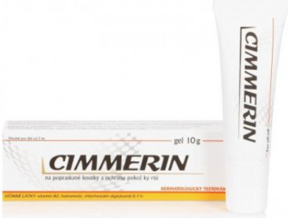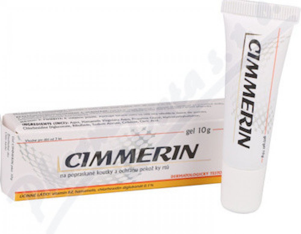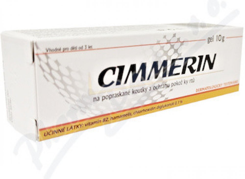Cimmerin gel na koutky je přípravek s bakteriostatickým účinkem určený k ochraně a péči o pokožku úst a koutky. Díky obsahu vitaminu B, hamamelis a chlorhexidinu se doporučuje pro osoby náchylné k praskání koutků úst (angular cheilitis), praskání kůže úst, odřenin a loupání kůže úst.Cimmerin gel vytváří na ústech ochranný bakteriostatický film. Složky obsažené v gelu mají stahující a regenerativní účinek a ochraňují poškozenou pokožku úst před vnějšími vlivy.Balení obsahuje 10 g.
