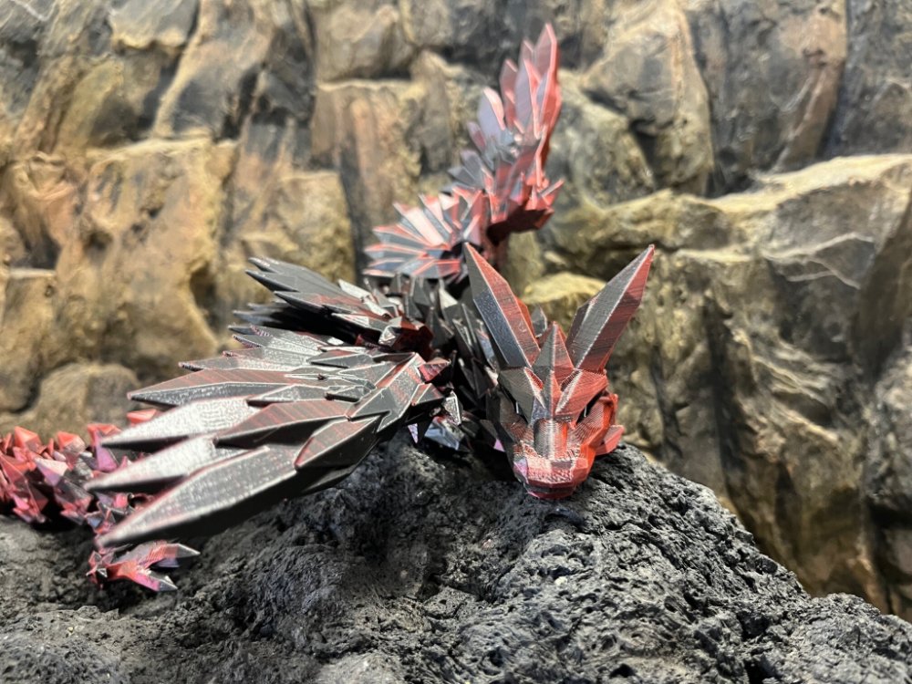 Tento majestátní krystalový drak s křídly vzniká z kvalitních filamentů a je tištěn na 3D tiskárnách Prusa. Jeho artikulovaná (flexi) konstrukce umožňuje plynulý pohyb – může se ladně stočit, rozpřáhnout křídla nebo hrdě stát na polici.