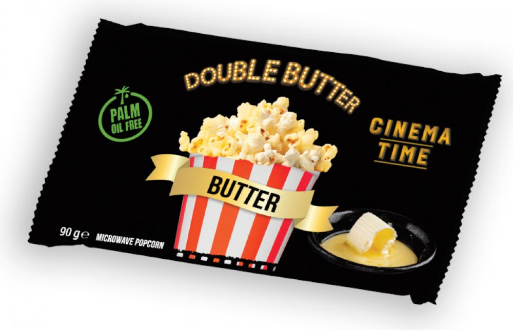 Cinema Time Mikrovlnný popcorn Premium Double Butter 90 g. Potravina výlučně rostlinného původu. Kukuřice obsahuje, vitamíny, minerály, vlákninu. Neobsahuje lepek, má nízkou energetickou hodnotu a příznivý glykemický index. Patří do skupiny zdravé výživy s minimem soli. Složení: Kukuřice 80 %, řepkový olej, sůl, plně ztužený řepkový olej, přepuštěné máslo 1,5 % ( mléko ), bambucký tuk, máslové ar...