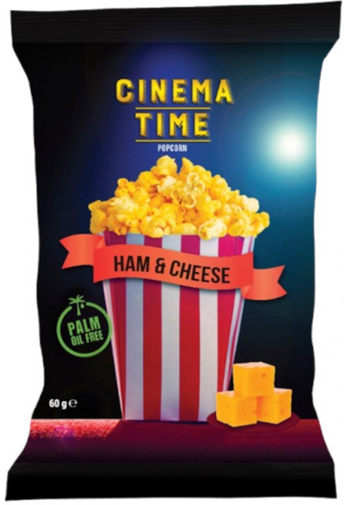 Vypukaný (hotový) popcorn s příchutí Šunka & Sýr Cinema Time, balení 60g.