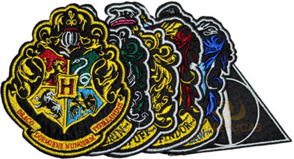 Sada šesti bavlněných nášivek o velikosti 9 x 11 cm. Jde o znaky jednotlivých bradavických kolejí (Nebelvír, Havraspár, Zmijozel a Mrzimor), znak Bradavické školy čar a kouzel a znak relikvií smrti (ten má velikost 9x8 cm).