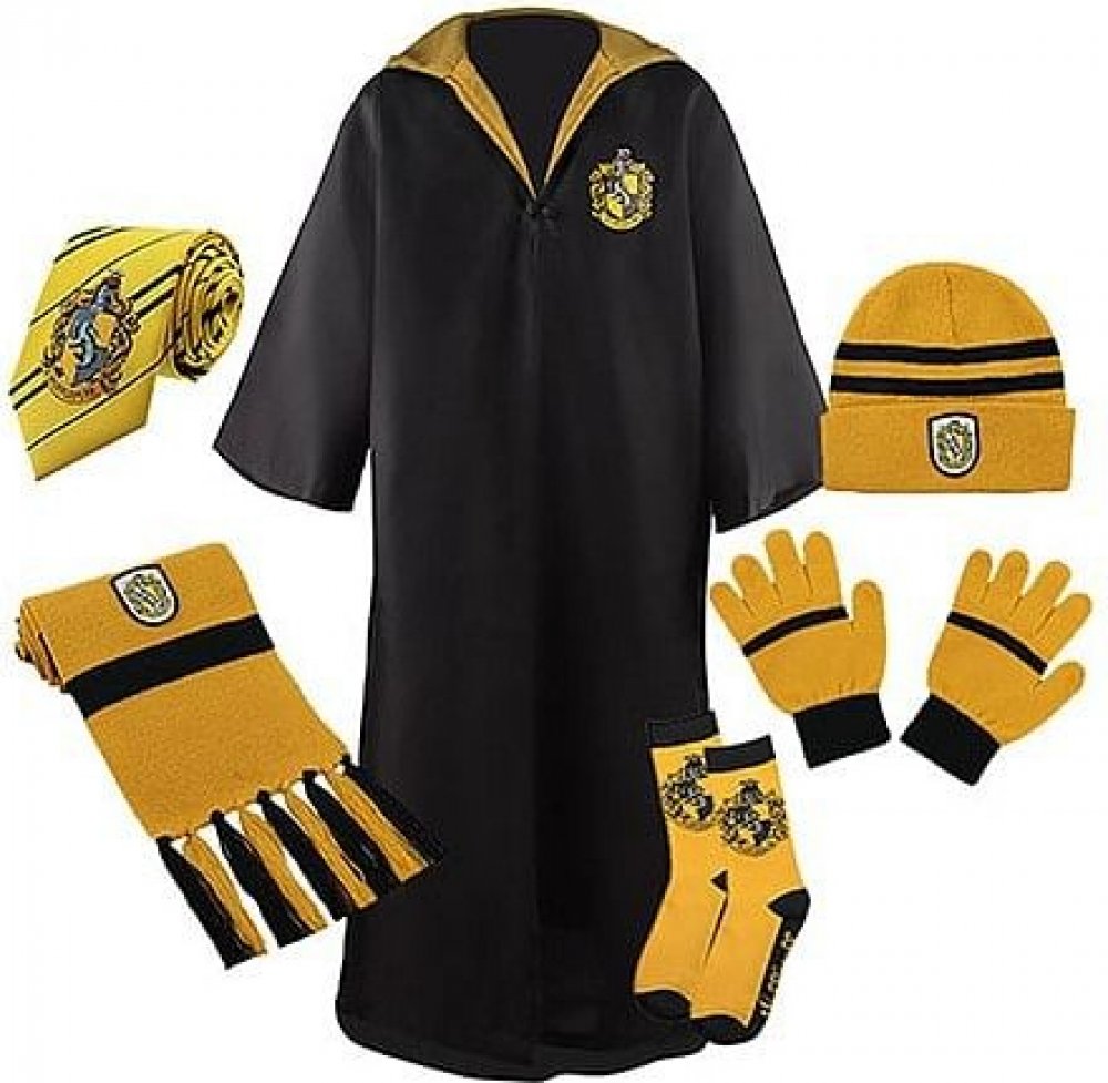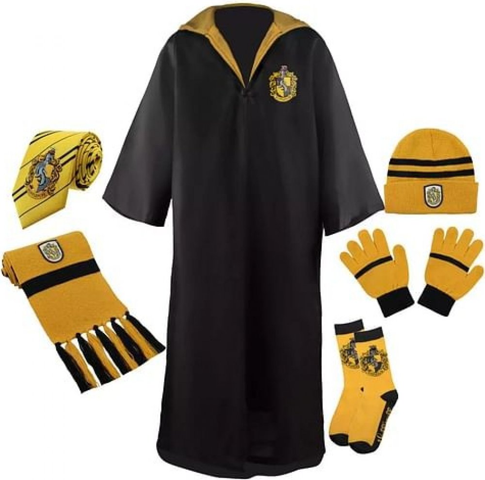 Dárková sada s kostýmem pro fanoušky Harry Pottera obsahuje kouzelnický hábit v barvách mrzimorské koleje, čepici, rukavice, šálu, ponožky a kravatu. Správný kostým pro správné mágy a čarodějky z Bradavic! Pro čarodějky můžeme ke kostýmu doporučit také pěknou čelenku a gumičku do vlasů.