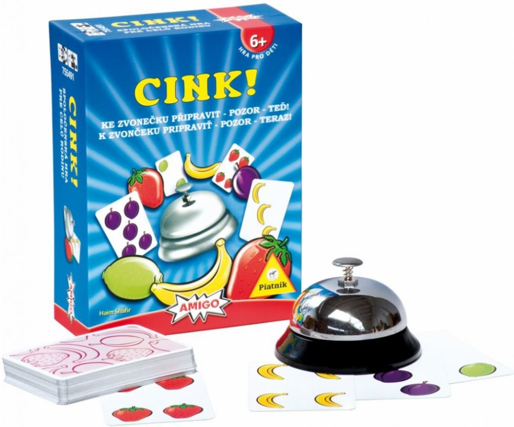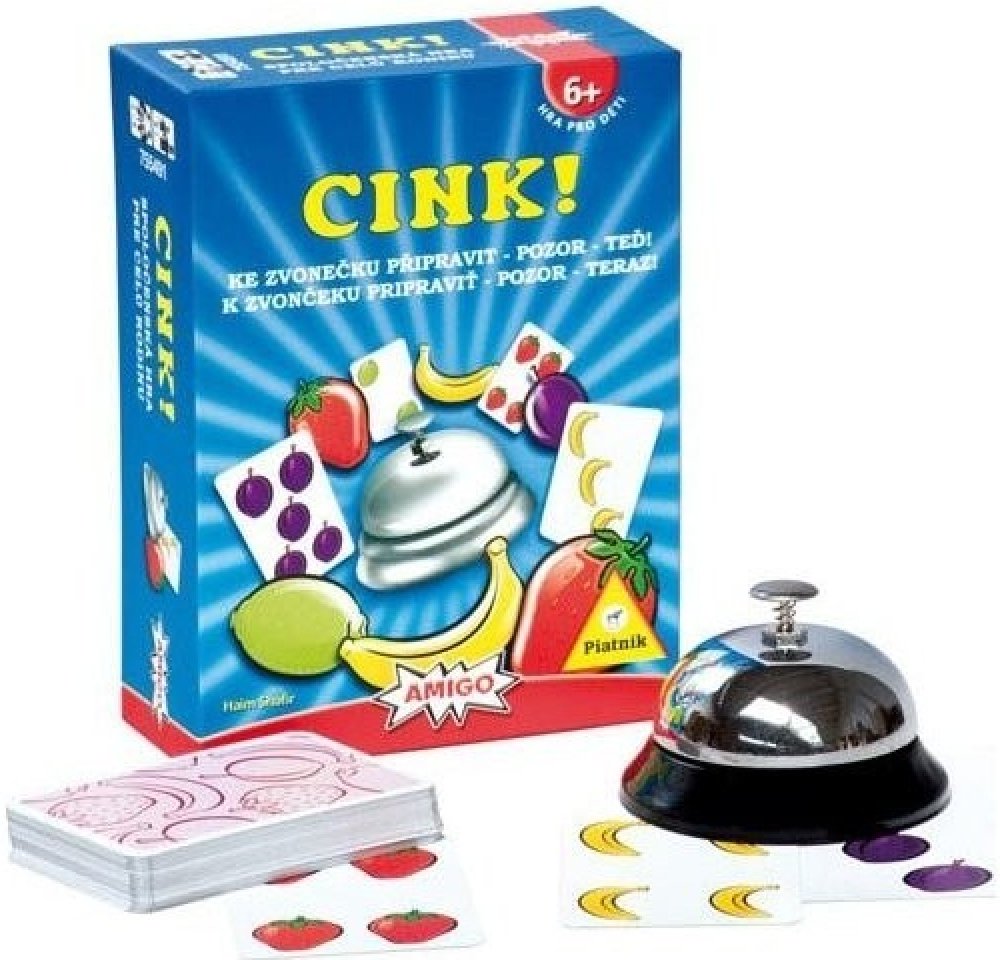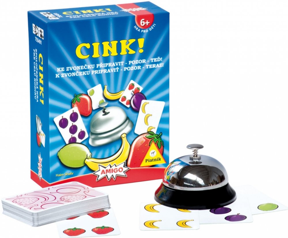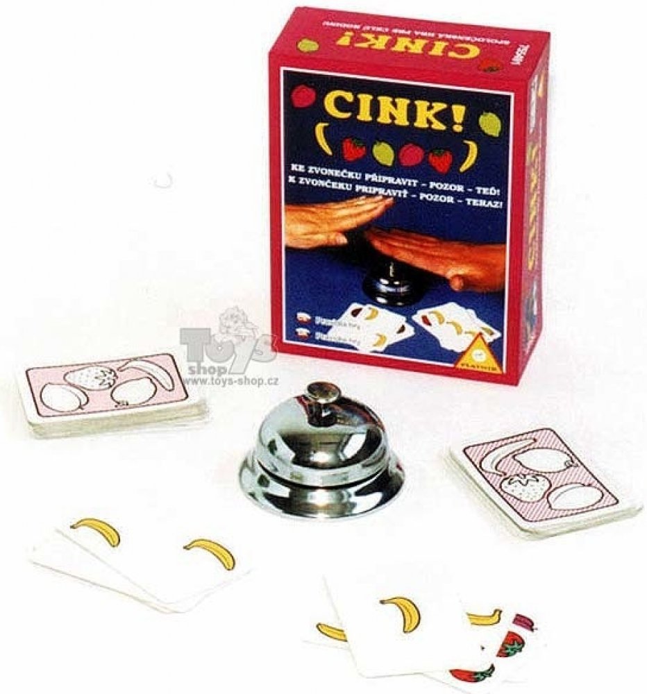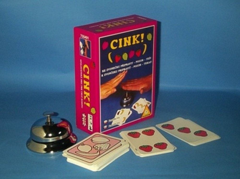 CINK! - Společenská hra pro malé i velké soutěživce. Znáte ten kouzelný zvoneček, který dřív zdobil recepce hotelů? Ten Vás bude touto hrou provázet. Tato úžasná hra pro celou rodinu s kartami a zvonečkem je velmi jednoduchá, rozvíjí postřeh a rychlou reakci. Hráči jeden po druhém rychle otáčí kartičky s obrázky banánů, jahod, citronů a švestek. Každý dává karty na svoji hromádku a sleduje i karty...