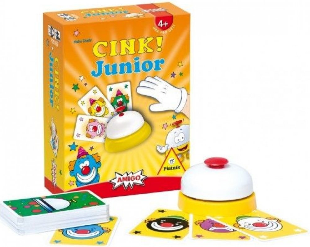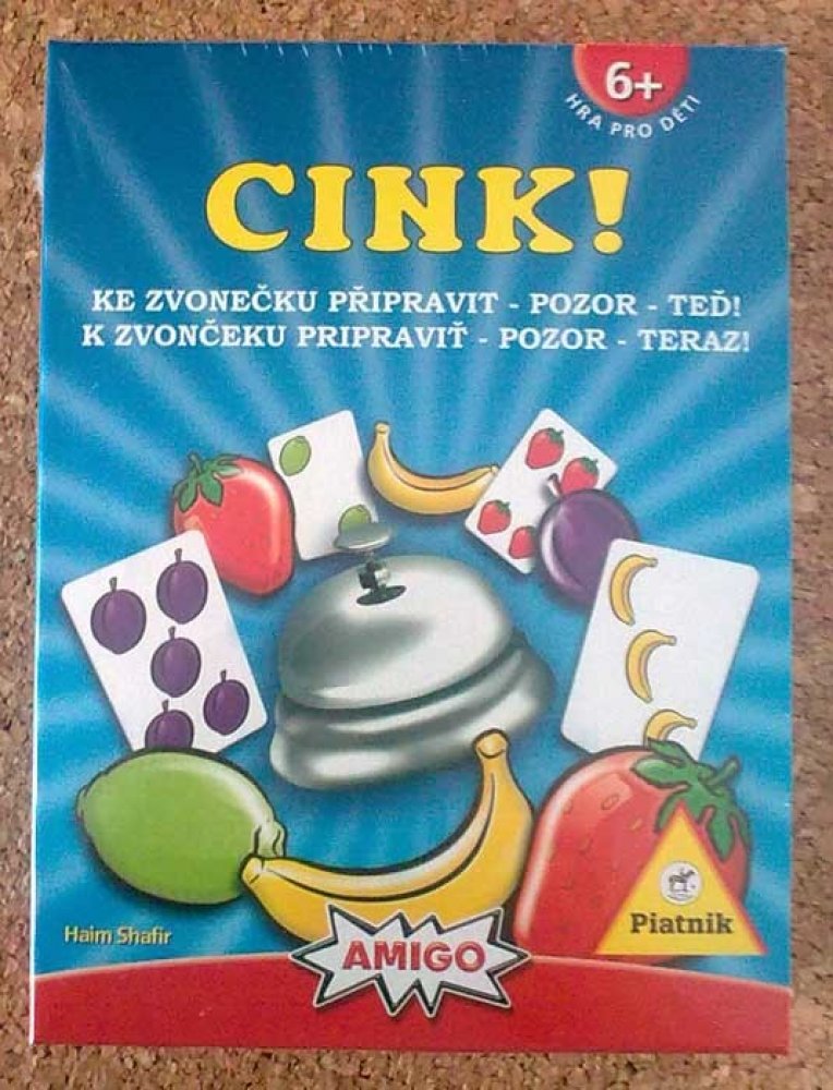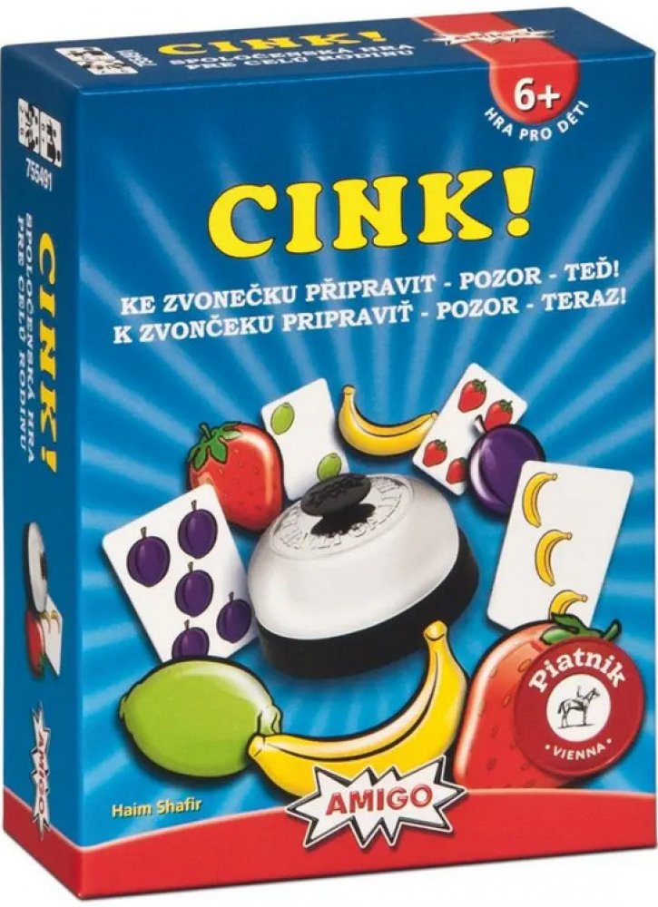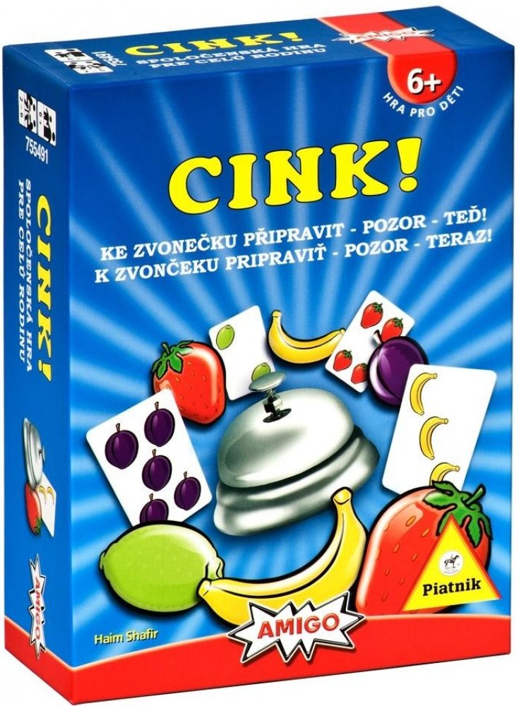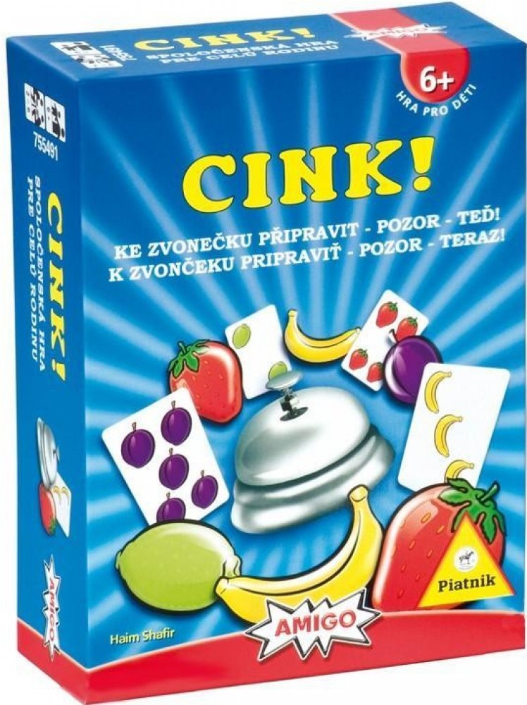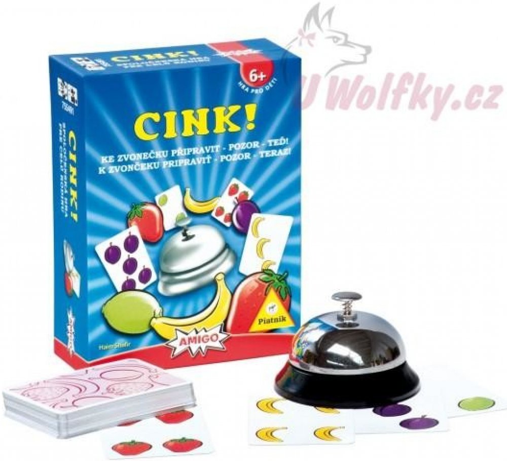 CINK! - Společenská hra pro malé i velké soutěživce. Znáte ten kouzelný zvoneček, který dřív zdobil recepce hotelů? Ten Vás bude touto hrou provázet. Tato úžasná hra pro celou rodinu s kartami a zvonečkem je velmi jednoduchá, rozvíjí postřeh a rychlou reakci. Hráči jeden po druhém rychle otáčí kartičky s obrázky banánů, jahod, citronů a švestek. Každý dává karty na svoji hromádku a sleduje i karty...