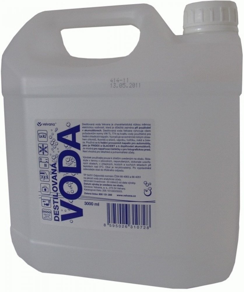 Destilovaná voda pro technické účely - k ředění kapalin v domácnostech i pro průmyslové použití. Čirá kapalina bez barvy, chuti a zápachu. Od obdobných přípravků se odlišuje výrazně nízkou měrnou elektrickou vodivostí, která je zejména důležitá při použití do akumulátoru. Destilovaná voda se používá k ředění kapalin - např. Fridexu, Fritermu, Glacidetu, k doplňování odparu Solarenu, k doplnění aku...