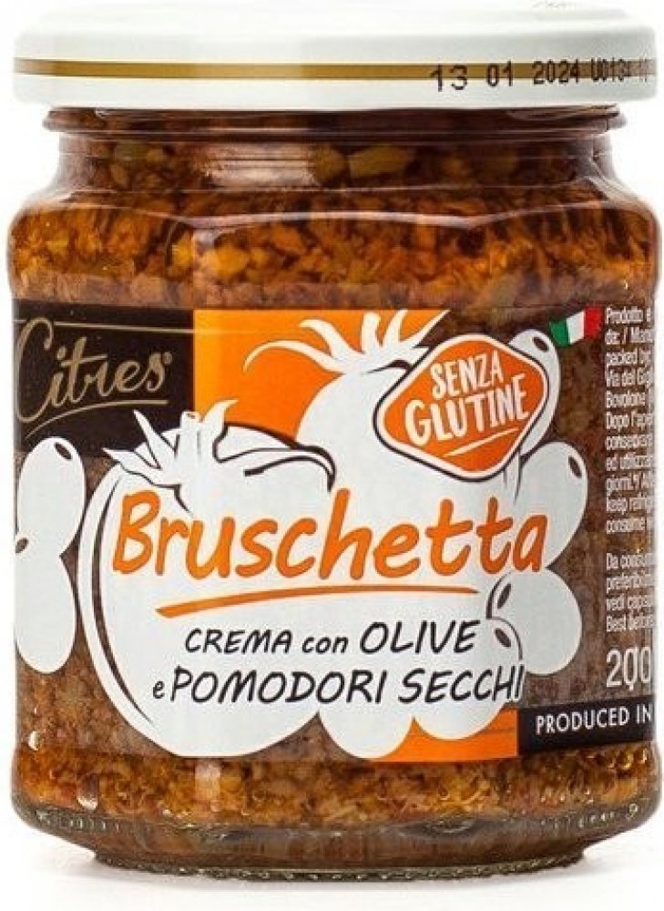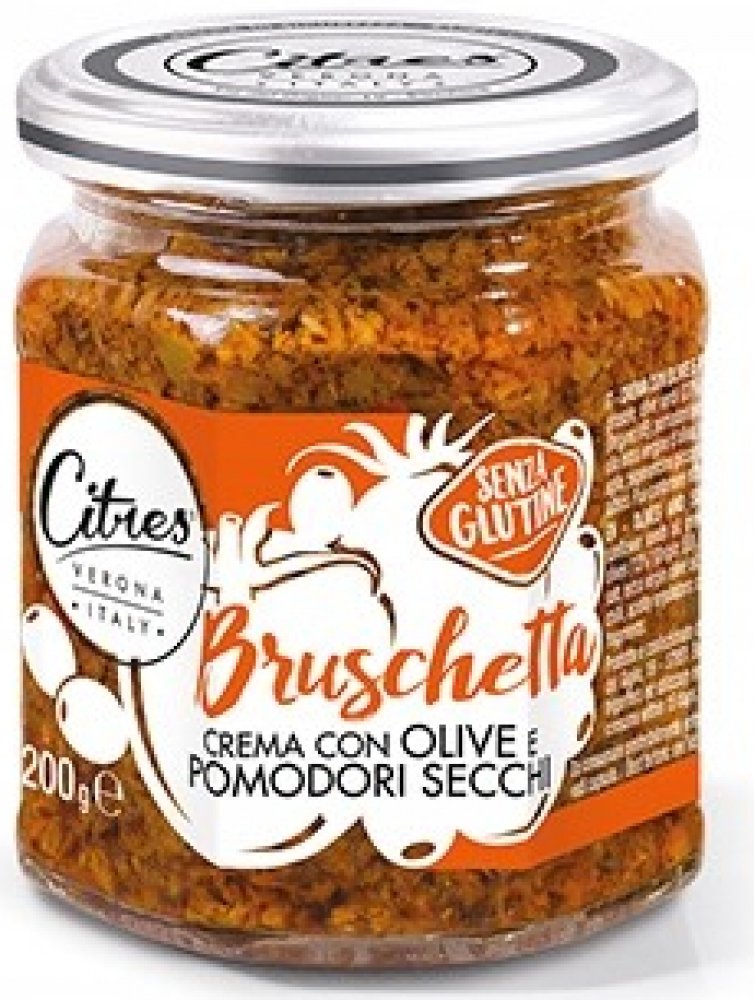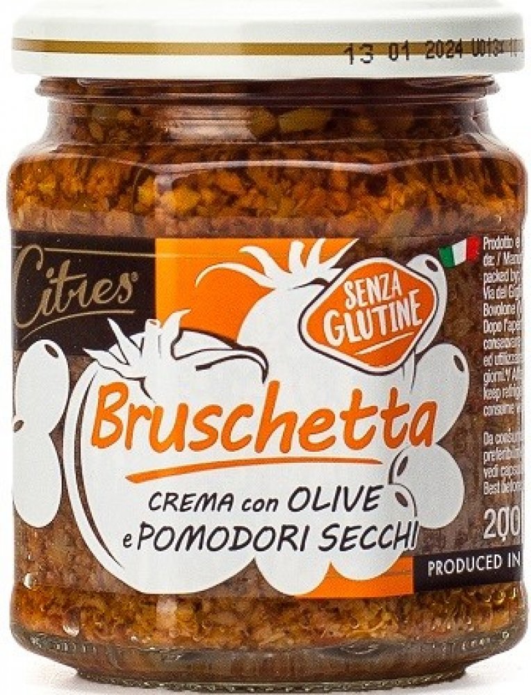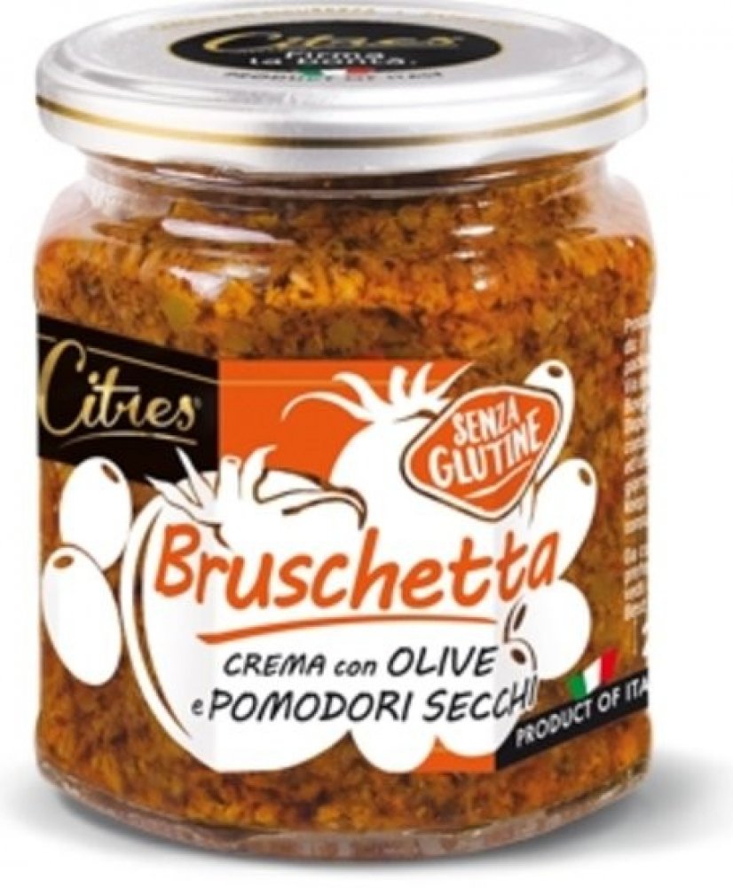 Citres Bruschetta pomazánka na pečivo se sušenými rajčaty a olivami - 200ghotová pomazánka pro rychlou přípravu předkrmů. Italská produkce oliv a rajčat zaručuje kvalitní a plnou chuť této pomazánky. Jemně krájená sušená rajčata a výběrové olivy v olivovém oleji.