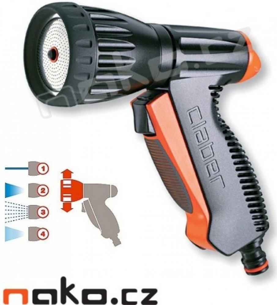 Komfortní zavlažovací pistole je vybavena nástavcem se 4mi tryskami, se soustředěným proudem, rozstřikem pro kropení, sprchou a rozprašovačem. Volit je lze jednoduchým pootočením koncovky na pistoli. Díky praktickému ovládání spouští lze vodu snadno zapínat a vypínat. Pistole je vybavena protiskluzovým ergonomickým držadlem s jednoduše ovladatelnou plynulou regulací přítoku vody. Vhodná pro zalévání nebo venkovní úklid..
