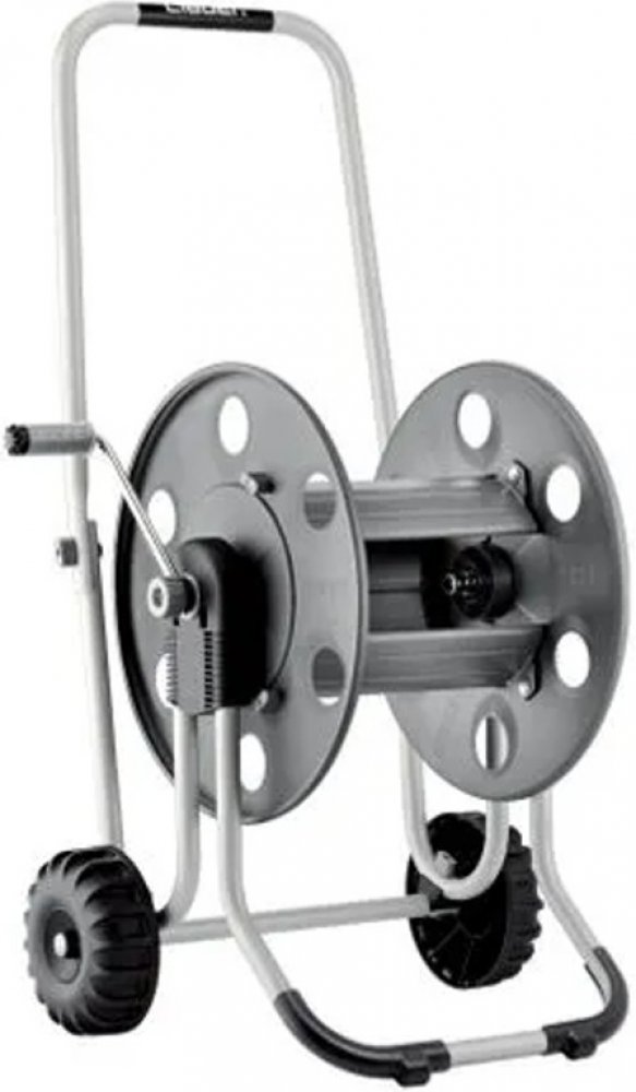 Přenosný naviják na hadici Aquapony může volně stát nebo být zavěšen na zdi v balení s rychlospojkou na zahradní hadici.
