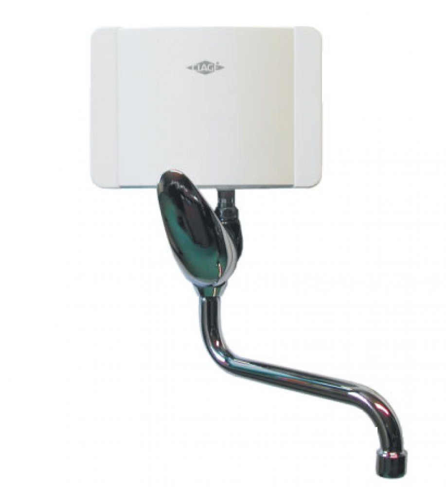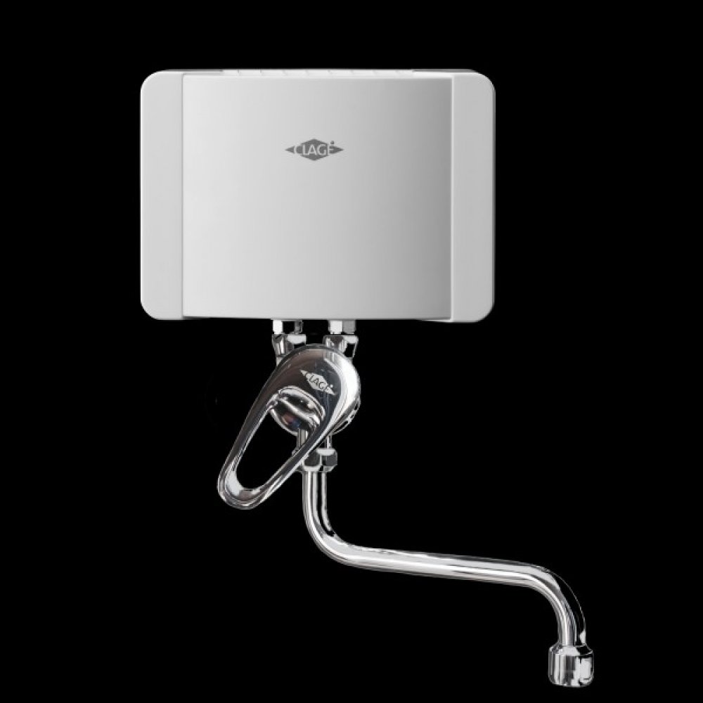 Malý průtokový ohřívač pro jedno odběrové místo v kompletu s pákovou armaturou, určený pro instalaci k umyvadlu.