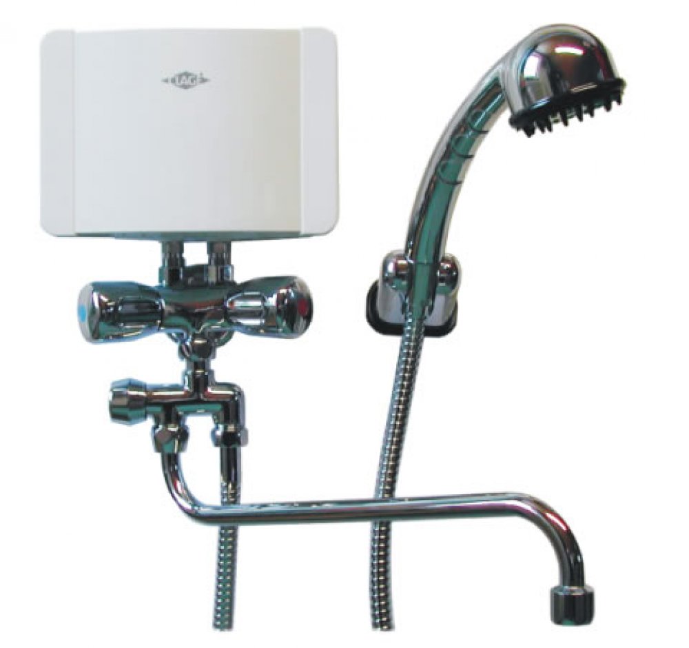 Sestava malého průtokového ohřívače v kompletu s kombinovanou baterií pro umyvadlo a sprchu. Kohoutková baterie je vybavena přepínačem pro napojení sprchové hadice a otočným výtokovým raménkem o délce 30 cm. Vhodné pro místa s omezeným příkonem elektrické přípojky a zaměřením na letní provoz. Komplet osahuje vše pro okamžitou montáž a nabízí dobrý poměr výkonu a ceny.