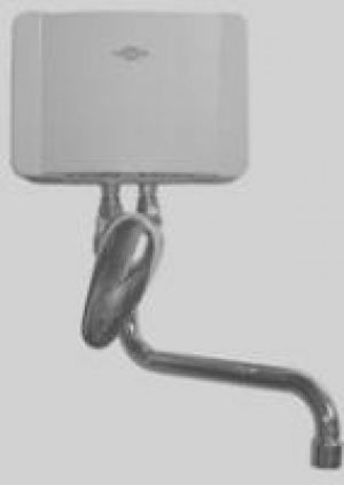 Malý průtokový ohřívač pro jedno odběrové místo v kompletu s pákovou armaturou, určený pro instalaci k umyvadlu.