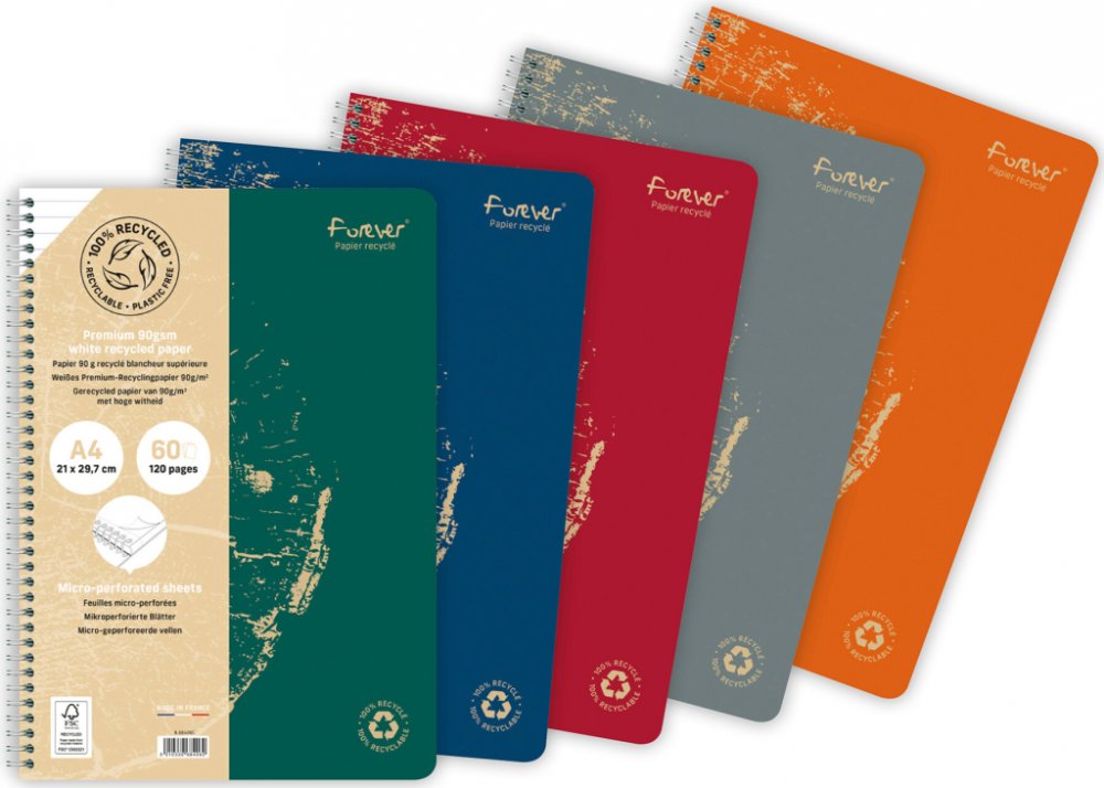 Blok s dvojitou spirálou má listy s dokonale hladkým povrchem a s mikroperforací pro snadné odtržení listů. Obálka: 100% recyklovaný karton. Papír: 100% recyklovaný, 90 g/m2, 60 listů. Linka: 8 mm. Cena za ks.