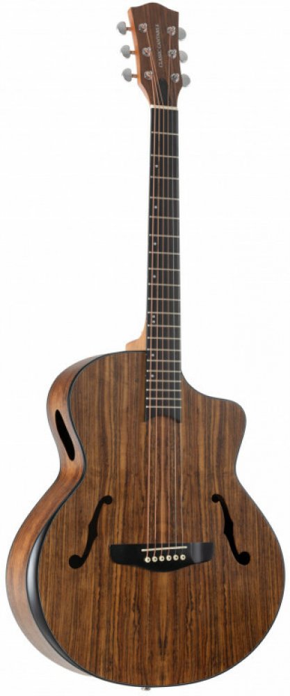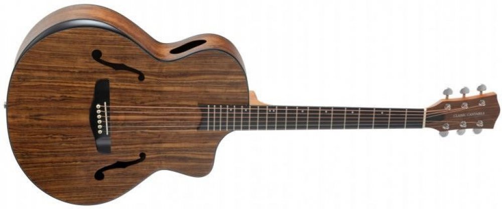 Classic Cantabile SHG-2WN LaBelle SHG-2WN LaBelle od Classic Cantabile se na první pohled odlišuje od ostatních kytar. Místo centrálně umístěného rezonančního otvoru má tato akustická kytara dva F otvory. Tělo z ořechového dřeva s nádhernou dřevokres