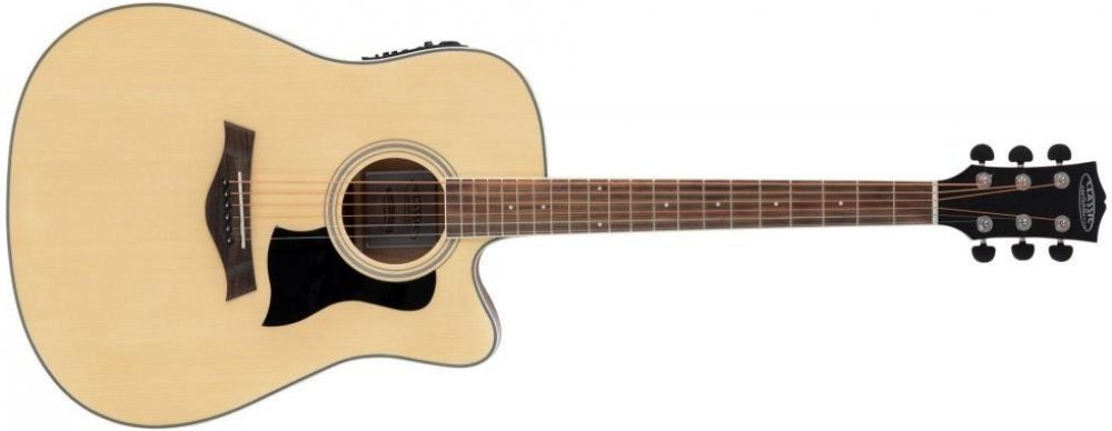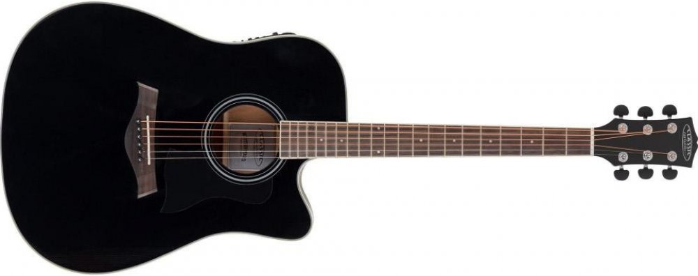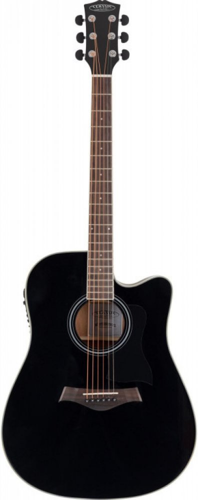 Elektroakustická kytara typu dreadnought leském černém provedení s přední deskou ze smrkového dřeva a zadní deskou a luby z Mahagonu Sapele. Krk je vyroben z javoru. Šířka těla 40 cm, šířka nultého pražce 43 mm. Nechybí olejová mechanika, perleťové vložky, hardware v provedení chrom nebo vestavěný předzesilovač s 3-pásmovým ekvalizérem a LED kontrolkou stavu baterie. Tato kytara kombinuje elegantní design s kvalitním zpracováním a může být Vaše za přijatelnou cenu.