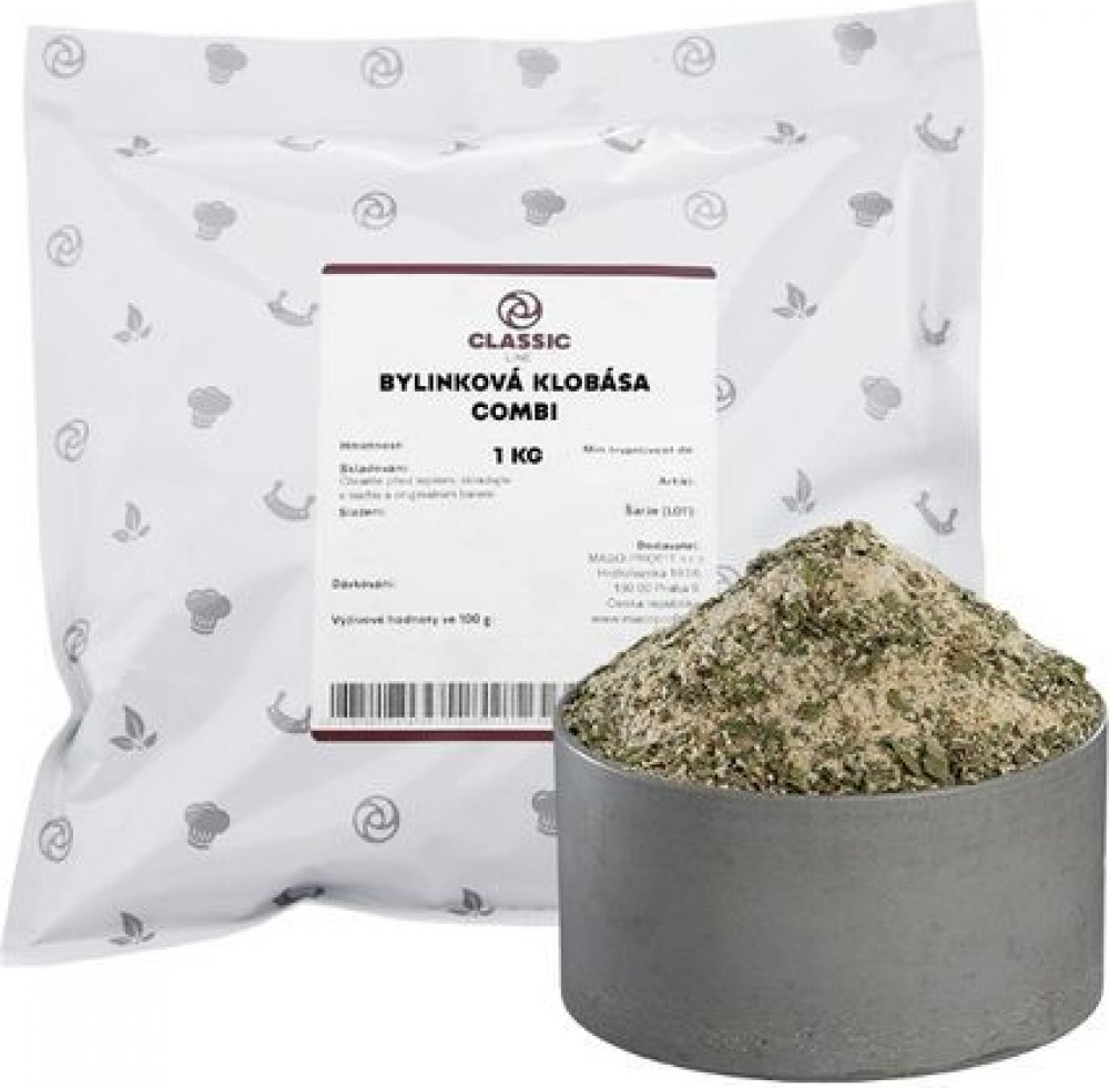 Přineste do svých klobás čerstvou a voňavou chuť s Bylinkovou klobásou Combi z řady Classic Line! Tato směs obsahuje sušenou zeleninu jako cibuli, petržel a česnek, která dodává pokrmům přírodní svěžest. V kombinaci s pepřem, zázvorem, kmínem a muškátovým ořech vytváří harmonickou a aromatickou chuť, kterou si každý zamiluje.✅ Přírodní zelenina – cibule, petržel a česnek pro bohatou chuť✅ Vyvážené koření – pepř, zázvor, kmín a muškátový ořech✅ Zvýraznění chuti a vůně – pro plnější chuťový profil Doporučené dávkování: 9,5 g/kg Použití: Směs koření pro výrobu bylinkových klobás a dalších masných specialitVyzkoušejte Classic Line a připravte klobásy s čerstvým bylinkovým nádechem!Combi - kompletní směs koření s obsahem fosfátůKvalita od českých výrobcůTo je originální řada koření, přísad a směsí CLASSIC LINE. Naši technologové se spojili, aby společně vyvinuli produkt nadstandardní tuzemské kvality. Vyzkoušejte ho i vy.Řada CLASSIC LINE navazuje na dlouho tradici vysoce kvalitního českého řeznictví a uzenářství. Poctivý výrobek od Čechů pro Čechy vznikl za jediným účelem – usnadnit Vaši výrobu. Spolehlivost a stálost dodávaného koření jsou naše priority.Objem výroby roste a udržet vysokou kvalitu masných výrobků není jednoduchý úkol. Kořenící směsi musí uspokojit potřeby náročného zákazníka. Proto můžete v řadě CLASSIC LINE najít mimo jiné také směsi bez „Éček“, glutamátu, barviv nebo alergenů. Tyto směsi označujeme zkratkami BE, BG, BF a BA.Úcta k tradici, preference maloobchodních zákazníků a řeznické know-how jsou základní stavební kameny řady CLASSIC LINE, kořenící směsi pro živnostenské dílny, střední provozy i největší podniky masného průmyslu.Složení: Směs koření (cibule, petržel, česnek, pepř, zázvor, kmín, muškátový ořech), stabilizátor E451, látka zvýrazňující chuť a vůni E621, antioxidant E301, aroma.
