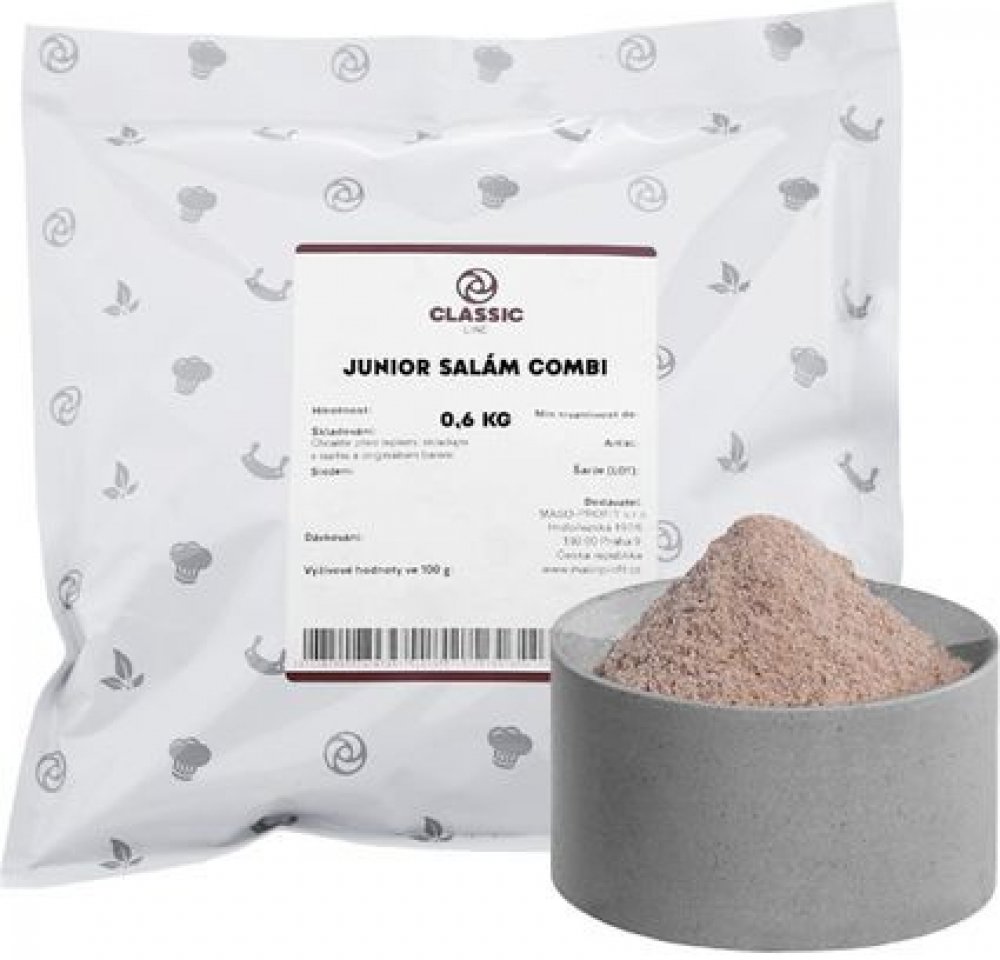 Směs Junior salám z řady Classic Line je ideální pro přípravu jemného a chutného salámu. Obsahuje pečlivě vybrané koření jako pepř, zázvor, česnek a muškátový květ, které dodávají výrobkům příjemnou a vyváženou chuť. Přidané složky zajistí optimální texturu a vzhled.✅ Vyvážená kombinace koření – pepř, zázvor, česnek a muškátový květ pro jemně kořeněnou chuť✅ Zvýrazňuje chuť a vůni – díky přídavku aromatu✅ Vhodné pro výrobu jemného salámu Doporučené dávkování: 8 g/kg Použití: Směs koření pro výrobu Junior salámu a dalších masných specialitVyzkoušejte Classic Line a připravte salám s jemnou a lahodnou chutí!Kvalita od českých výrobcůTo je originální řada koření, přísad a směsí CLASSIC LINE. Naši technologové se spojili, aby společně vyvinuli produkt nadstandardní tuzemské kvality. Vyzkoušejte ho i vy.Řada CLASSIC LINE navazuje na dlouho tradici vysoce kvalitního českého řeznictví a uzenářství. Poctivý výrobek od Čechů pro Čechy vznikl za jediným účelem – usnadnit Vaši výrobu. Spolehlivost a stálost dodávaného koření jsou naše priority.Objem výroby roste a udržet vysokou kvalitu masných výrobků není jednoduchý úkol. Kořenící směsi musí uspokojit potřeby náročného zákazníka. Proto můžete v řadě CLASSIC LINE najít mimo jiné také směsi bez „Éček“, glutamátu, barviv nebo alergenů. Tyto směsi označujeme zkratkami BE, BG, BF a BA.Úcta k tradici, preference maloobchodních zákazníků a řeznické know-how jsou základní stavební kameny řady CLASSIC LINE, kořenící směsi pro živnostenské dílny, střední provozy i největší podniky masného průmyslu.Složení: Stabilizátor E451, koření (pepř, zázvor, česnek, muškátový květ), látka zvýrazňující chuť a vůni E621, aroma, antioxidant E300, jedlá sůl, barvivo E120.