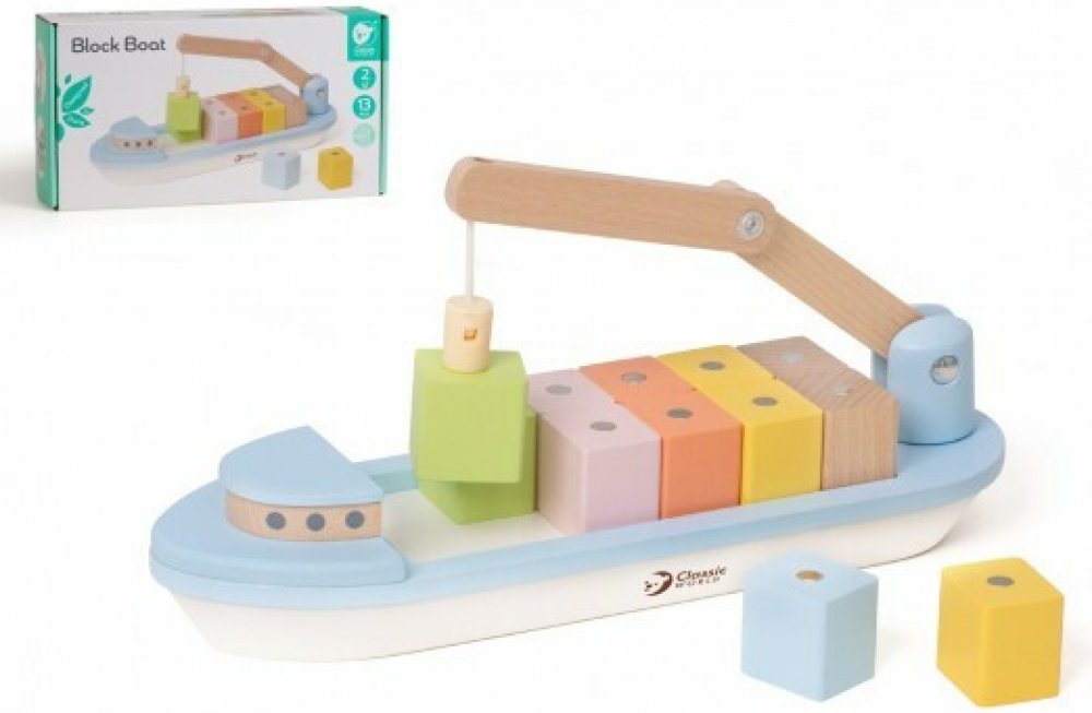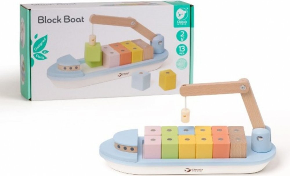 Wooden Stacking Ship od značky CLASSIC WORLD je zábavná malá nákladní loď naložená spoustou zboží. Loď má 12 barevných magnetických bloků a děti je mohou libovolně nakládat a vykládat pohybem flexibilního jeřábu. Barevná loď poskytne vašemu batoleti hodiny nápadité zábavy, zlepší jeho obratnost a koncentraci.