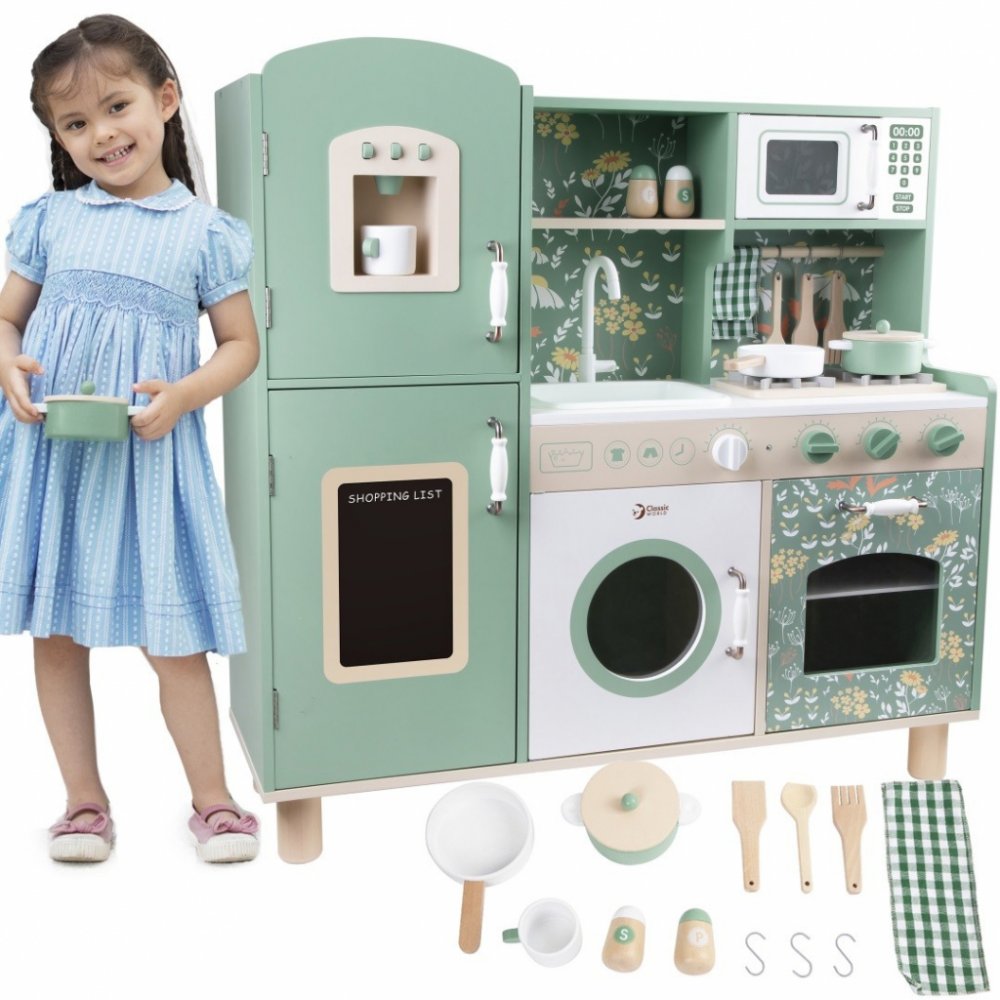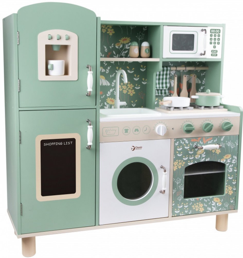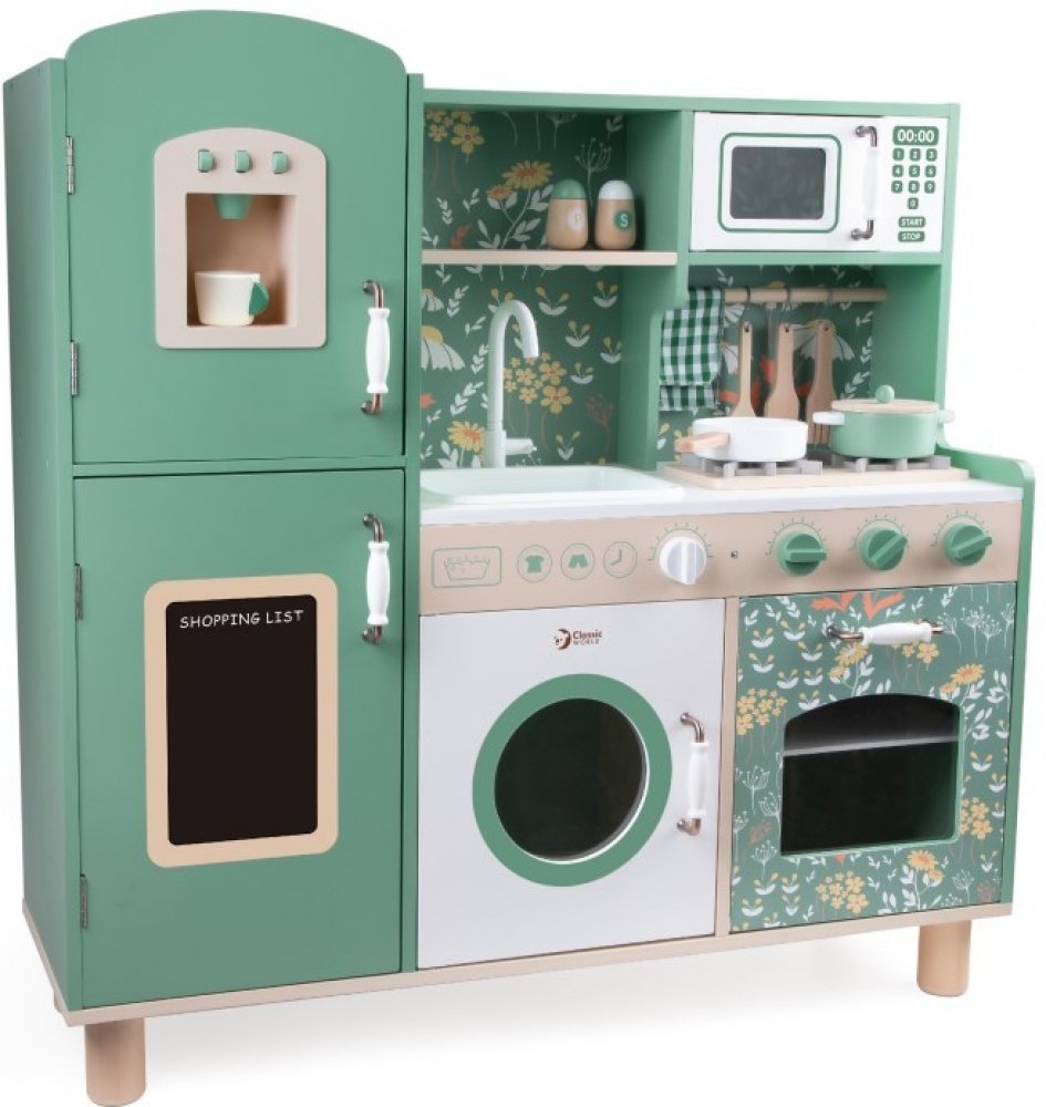 Krásná dřevěná kuchyňka pro děti, v barevné kombinaci přírodního dřeva, bílé a zelené barvy, zdobená květinovým vzorem, je tím pravým místem pro malé kuchtíky a hospodyňky. Parádní dětská kuchyňka vybavená vestavěnou lednicí, kávovarem, pračkou, dřezem na nádobí, vařičem, troubou i mikrovlnnou troubou nabízí nespočet možností ke hře. Spolu s příslušenstvím v podobě nádobí, solničky, pepřenky, utěrky a háčků umožní dětem v kuchyňce nejen vařit, péct a ohřívat, ale i umývat nádobí, prát prádlo nebo připravovat lahodou kávu. Barevně sladěná kuchyňka s doplňky bude ozdobou dětského pokojíčku. Při hře v kuchyňce si děti vyzkouší dospělácké činnosti bezpečným dětským způsobem, zdokonalují motorické dovednosti a manuální zručnost, koordinaci, rozvíjí svou fantazii a kreativitu, komunikační dovednosti, hrají role.