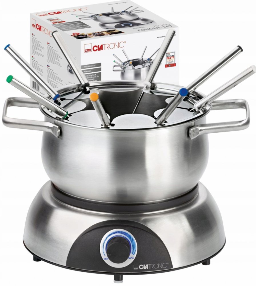 Sada fondue CLATRONIC umožňuje populární variantu stolování s rodinou či přáteli. Vychutnejte si čokoládové, masové nebo sýrové fondue jako na exkluzivní dovolené. Kromě masa můžete také vyzkoušet namáčet třeba krevety, ryby a zeleninu. Elektrický ohřev umožňuje udržet konstantní teplotu s možností přesného nastavení, což je nezbytné pro dosažení optimální konzistence a chuti při přípravě různých pokrmů. Fondue set byl vyroben z kvalitního materiálu, jako je nerez. Nabízená sada bude vyhovovat nárokům 8 strávníků. Zásadní přednosti fondue Clatronic FD 3783 Fondue CLATRONIC představí nový způsob společného stolování s přáteli a rodinou Umožní vytvořit neodolatelné sýrové fondue i lahodné čokoládové fondue Elektrický ohřev udržuje optimální teplotu fondue Výrobním materiálem fondue je nerez Sada je ideální pro 8 osob