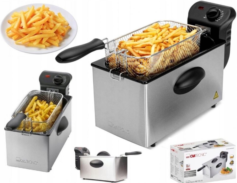 Clatronic FR 3586 - podrobné informace: Vyjímatelné topné těleso je ponořeno přímo v oleji, což umožňuje rychlý ohřev a absenci zápachu. Kapacita nádoby na olej je 3 litry. Tato nádoba je opatřena smaltovaným povrchem a je vyjímatelná. Madla na fritovacím hrnci jsou tepelně izolována a i během provozu zůstávají chladná. Výhodou je odkapávací miska. Teplota se nastavuje pomocí termostatu v rozmezí od 130 do 190 °C. O provozu informují kontrolky. Ve spodní části je prostor pro uložení napájecího kabelu, což usnadňuje transport nebo uskladnění. Fritovací hrnec je vybaven ochranou proti přehřátí. Napájení je 230 V, 50 Hz....