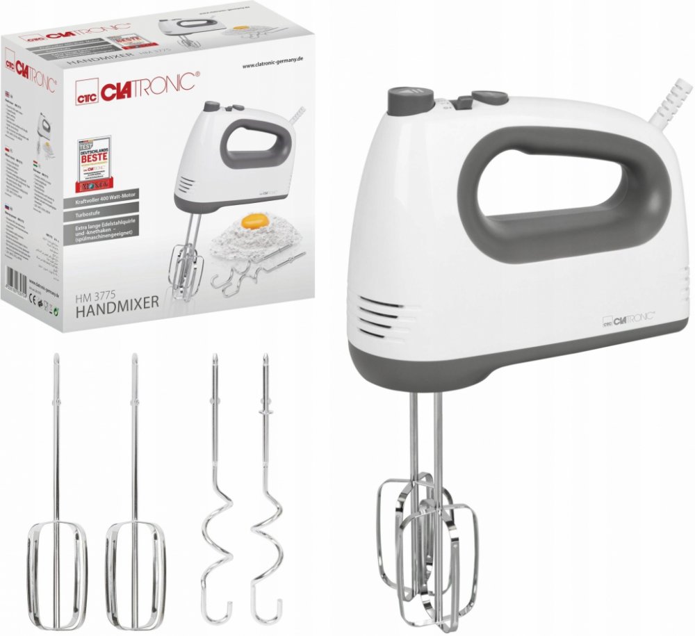 Ruční mixér HM 3775 značky Clatronic je opatřen 400 W motorem s 5 rychlostmi a turbo módem. Mixér je konstruován pro jednoduché a nenáročné použití. Je vybaven mechanismem pro rychlé uvolnění metliček. Metly jsou vyrobené z nerezové oceli a lze je mýt v myčce nádobí. Napájení je 220-240 V, 50 Hz, 400 W.