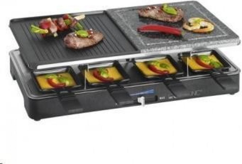 Raclette gril RG 3518 se skvěle hodí pro přípravu masa, ryb a zeleniny. Je vybaven přírodním grilovacím kamenem pro zdravé a nízkotučné grilování. Pro přípravu ryb a zeleniny slouží hladký povrch, pro maso pak povrch s drážkami pro silný grilovací vzor. Ke grilování můžete využít plochu o rozměrech až 46 x 23 cm. Termostat pro nastavení teploty je plynule nastavitelný. Součástí balení je 8 pánviček a 8 špachtliček. Grilovací plocha a pánvičky jsou opatřeny nepřilnavým povrchem. Gril dosahuje výkonu až 1 400 W. Napájení je 220-240 V, 50/60 Hz.