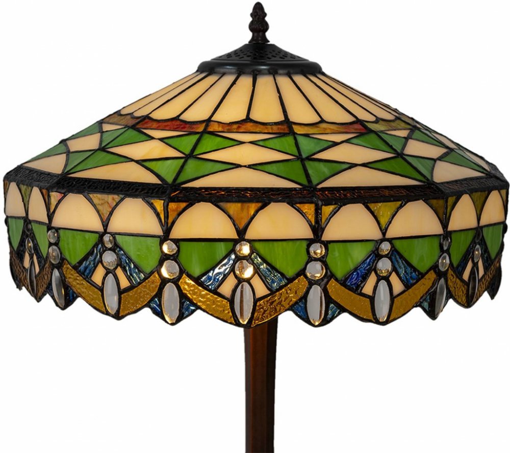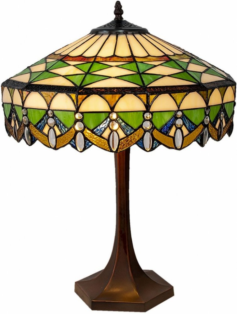 Krásná vitrážová stolní lampa TIFFANY. Zajímavý tvar stínidla s krásnou mozaikou z barevného skla potěší svým vzorem a hrou barev. Lampa mění barvy v závislosti na typu a sytosti osvětlení. Tento model ozdobí váš stůl, komodu nebo konzoli.. Barva: zelená. Materiál: polyrezin a sklo. Rozměry: Ø 41x57 cm E27/max 2x60W.