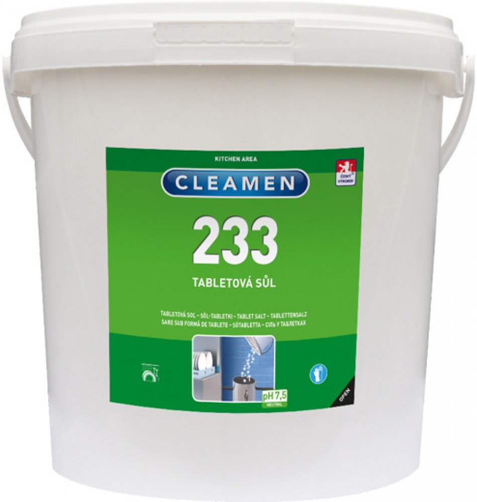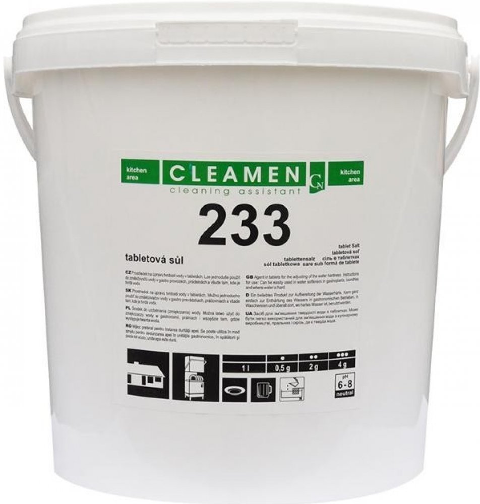 Specifikace Cleamen 233 tabletová sůl 10 kg Popis produktu Tradiční a oblíbený prostředek na úpravu tvrdosti vody. Tradiční a oblíbený prostředek na úpravu tvrdosti vody. Lze jednoduše použít do změkčovačů vody v gastro provozech, prádelnách a všude tam, kde se vyskytuje velmi tvrdá voda.
