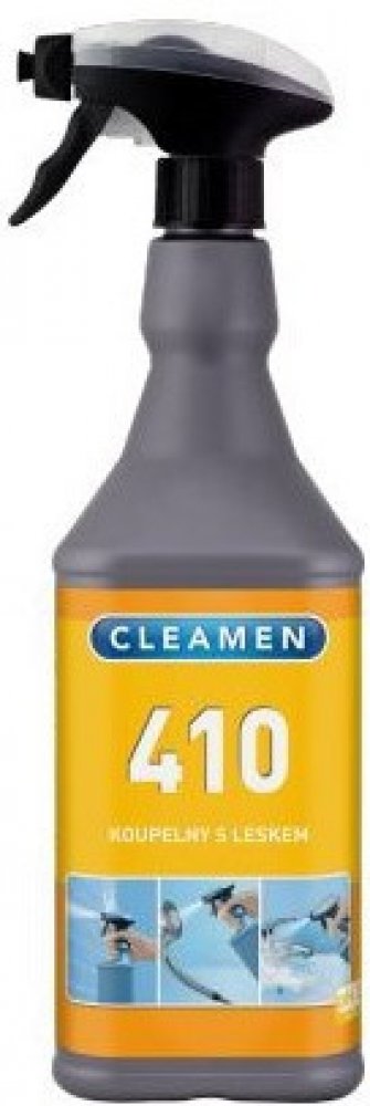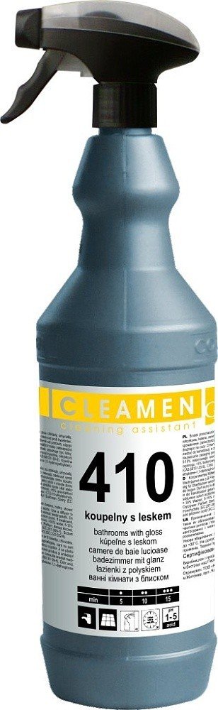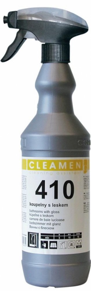 Cleamen 410 koupelny s leskem. Prostředek určený k mytí sanitárních a umývárenských ploch jako jsou obklady, umyvadla, vany, sprchové kouty, umyvadla, baterie, vnější části toaletních mís atd. Přípravek snadno odstraňuje skvrny a nánosy vodního kamene. Přípravek obsahuje lesk, který zpomaluje znečištění povrchu a dlouhodobě zlepšuje vzhled leštěných a chromovaných povrchů.