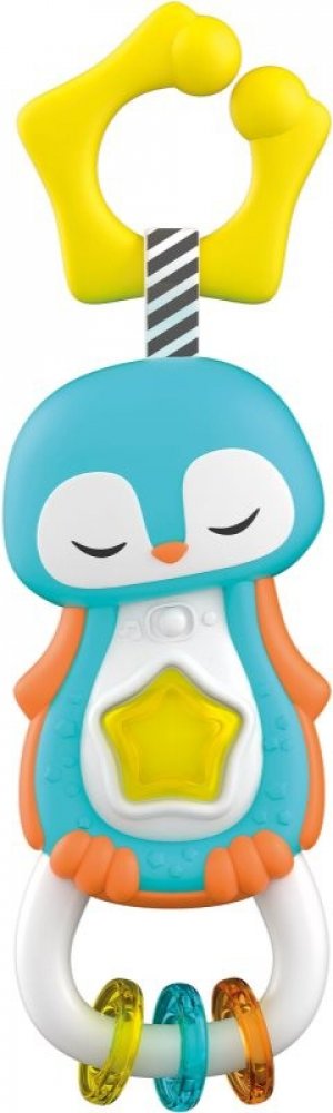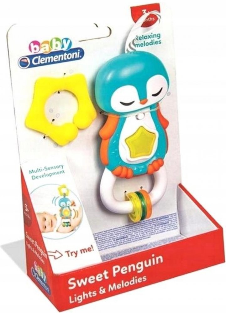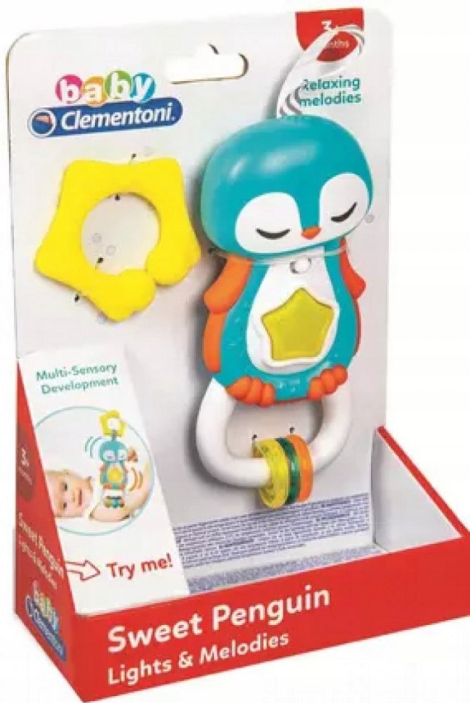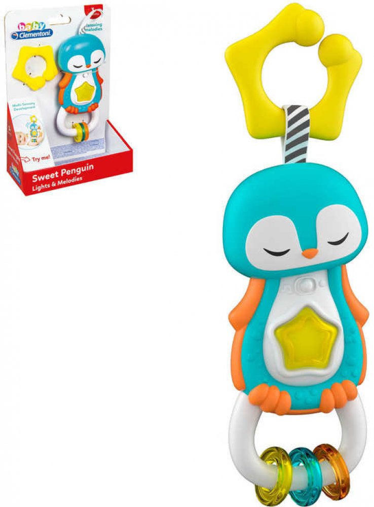 Clementoni interaktivní chrastítko tučňák. Stlačením rozsviť hvězdičku, aktivuj sladké melodie a zvukové efekty. Praktický kroužek na zavěšení do postýlky, kočárku nebo autosedačky. Přívěsky a různé druhy materiálů podporují rozvoj smyslů dítěte. Vyrobeno z kvalitního a nezávadného materiálu. Hračka na baterie, se světlem a zvukem.