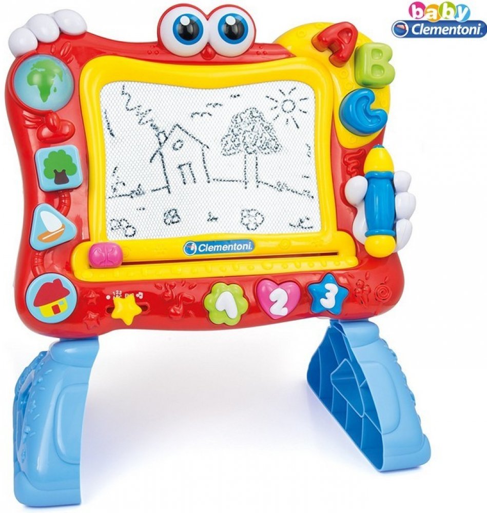 Clementoni Kreslící tabule 2v1: Krásná kreslicí výuková tabule! Na tabuli se naučí Vaše dítě své první písmena, první čísla, tvary a barvy s písněmi, které vám dávají první kresby od 18 měsíců věku! Magnetické pero, 6 snímatelných magnetických razítek a mnoho interaktivních tlačítek! Tabule má spousty interaktivých prvků, včetně světelných efektů, odnímatelných noh a spousty zvukových efektů. Baterie: 2x LR06 (součástí dodávky). Rozměr tabule: cca 36 x 32 x 7,5 cmRozměr Balení: 54,5 x 35 x 15 cmUPOZORŇUJEME