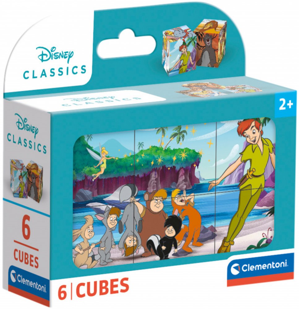 Sada 6 obrázkových kostek od Clementoni s motivem Disney classic. Lze sestavit 6 různých obrázků dle předlohy nebo využít ke klasické hře s kostkami, ke stavbě komínů a věží. Ideální pro stimulaci pozorovacích schopností, stejně jako logické a manuální dovednosti. Kostky jsou vyrobeny ze 100% recyklovaných a recyklovatelných materiálů.